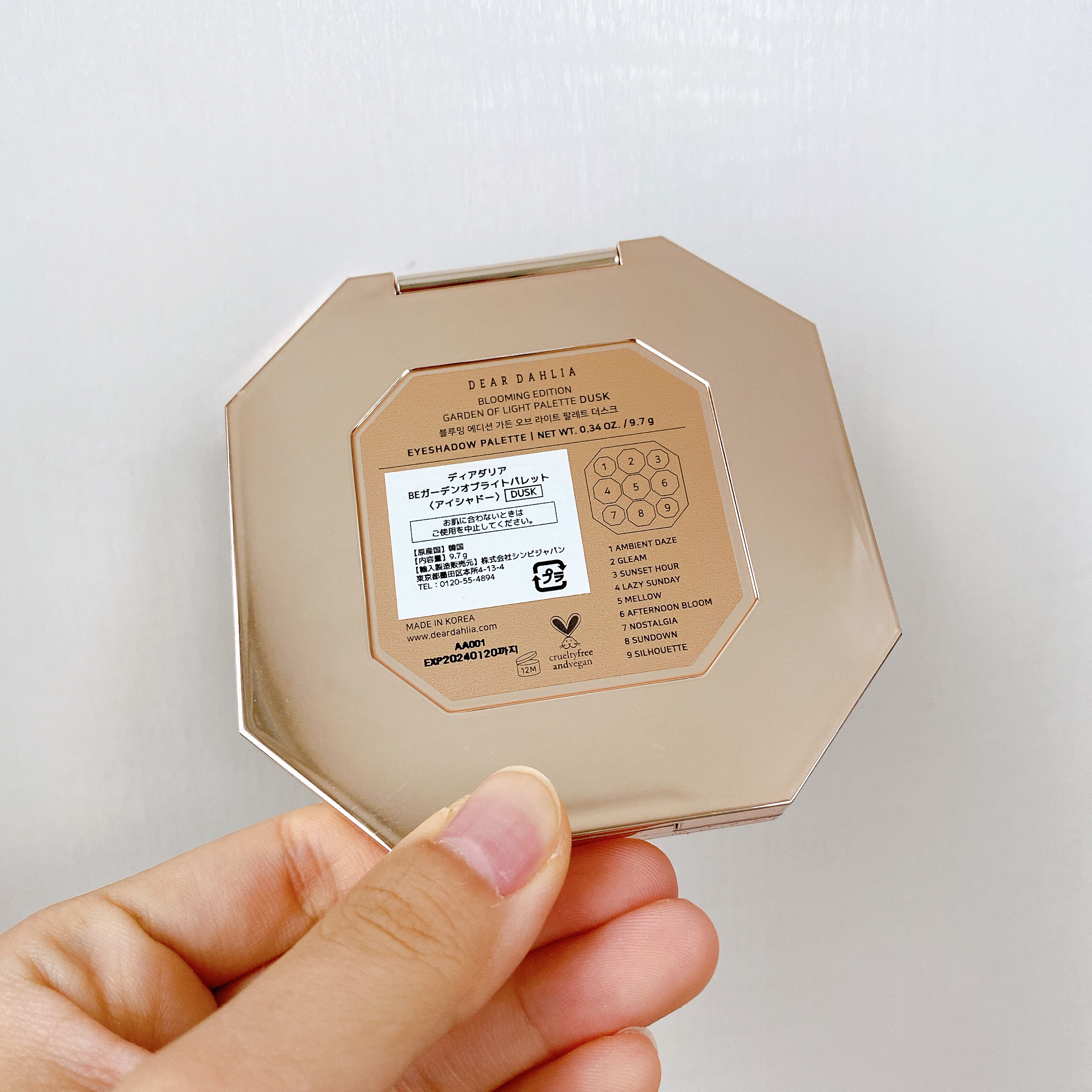 \キラキラ発色!パケ買いパレッド✨/《ブルーミングエディション ガーデンオブライトパレット DUSK》税込7,040円韓国コスメブランドDEARDAHLIAから発売されているアイシャドウパレット🤍🧡DEARDAHLIAは2017年に韓国でスタートした美容ブランド。八角形のパッケージはダリアの花をイメージして作られています💠動物性原料や動物実験を一切利用しない100%ヴィーガンブランドであることもDEARDAHLIAの特徴。肌馴染みのいいブラウンからピンクまで9色のカラーでデイリーメイクやカラーメイクも楽しめちゃいます🥰#ディアダリア#ブルーミングエディションガーデンオブライトパレット#DEARDAHLIA#涙袋メイク#メイク好きさんと繋がりたい#敏感肌#敏感肌スキンケア#qoo10メガ割#qoo10#qoo10購入品#デパコス#デパコス購入品#ご褒美コスメ#コスメ垢#コスメアカウント#韓国コスメ#デパコス#プチプラコスメ#コスメ好きさんと繋がりたい#コスメオタク#コスメレビュー#コスメレポ#お気に入りコスメ#コスメ紹介#スキンケア#スキンケア好きさんと繋がりたい#cosmeticanatural#cosme
