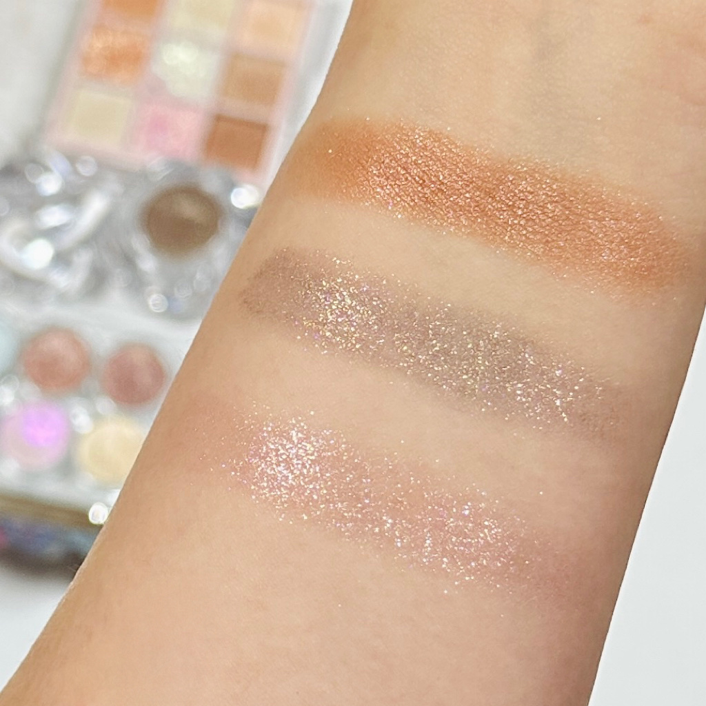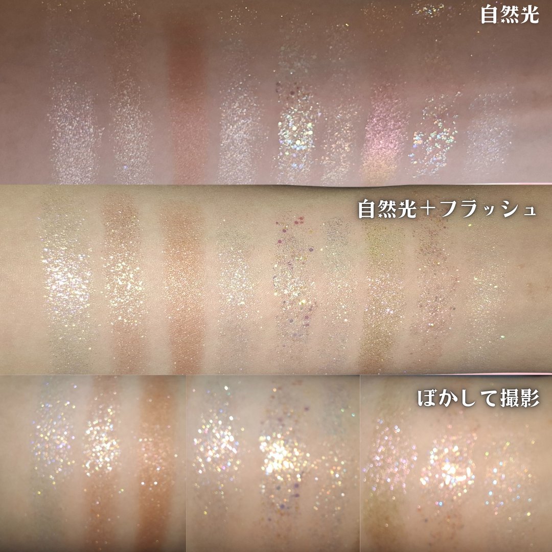小さいけどしっかり主張してくれるラメから、 偏光ラメ、大粒ホログラムまで多種多様! ベースカラーがしっかり色づくものもあるので 色んなメイクに使えそうです! 固めのブラシで取ったら掘れるくらい柔らかいテクスチャーです! ホログラムは特に、指でとると指に残りやすいので ブラシでとってトントンと瞼にのせると瞼につきやすいです! ラメ色が派手すぎず、グリッターの中ではナチュラルめに華やかになってくれるので、 毎日キラキラメイクしたい人にぴったり! このパレットはベースカラーがそんなに発色しないので、 下のアイシャドウの色を潰しにくいのが特徴です☝️