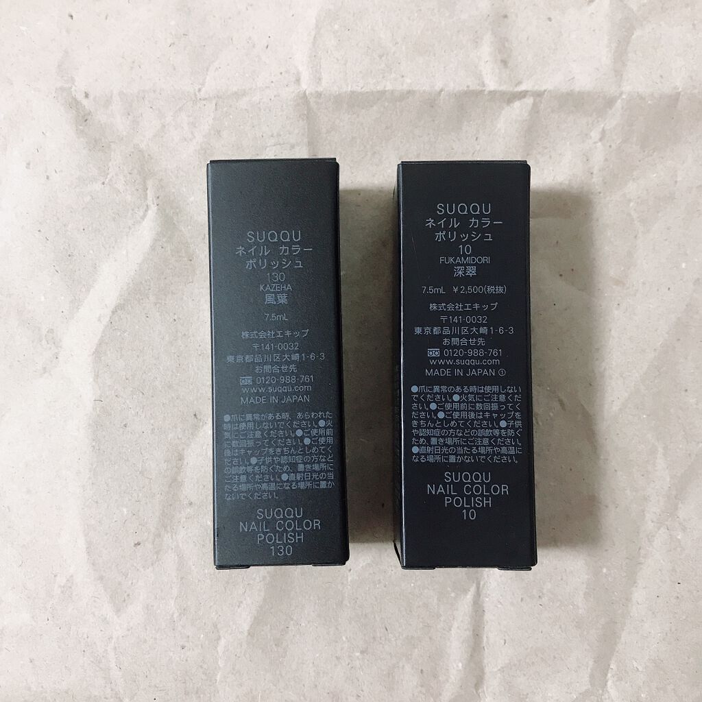 SUQQUネイルカラーポリッシュ10深翠-FUKAMIDORI130風葉-KAZEHA定番カラーの深いグリーン。限定カラーのカラシ色。写真は130番を手に塗っています。色もちも良く、塗りやすかったです。#SUQQU#ネイルカラーポリッシュ#深...