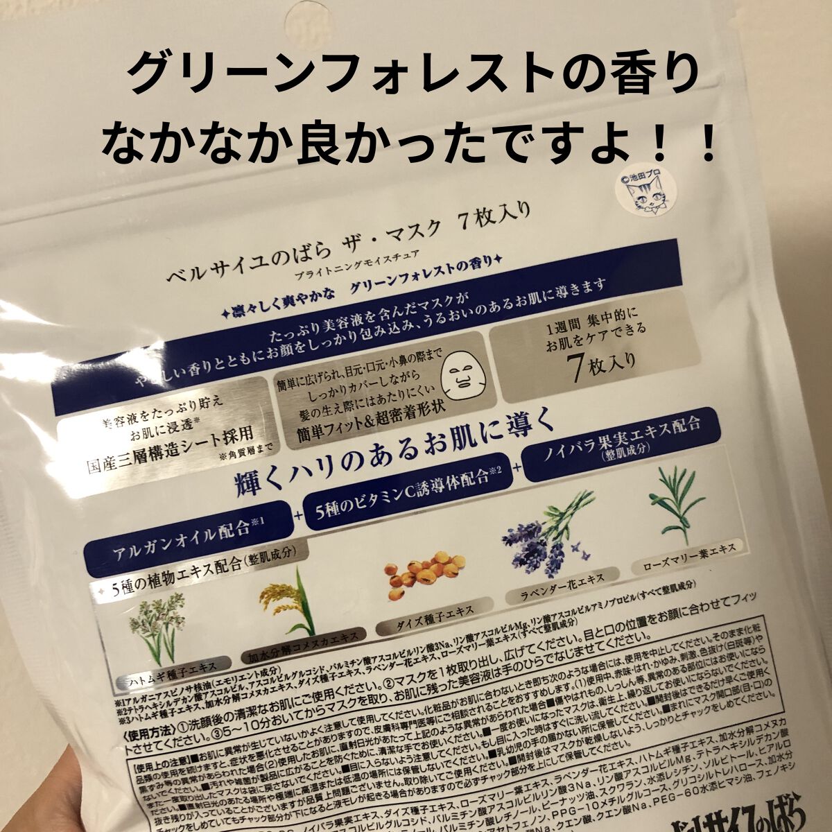ベルサイユのバラなのは、パッケージだけで、中身は普通の白いパックでした。 しっかりとした硬めの素材です🙆♀️ 香りはグリーンフォレストの香りとありますが、フローラルっぽいアロマ系の癒される香りでとてもよかったです✨ 7枚入っていたので、コスパ的にはよかったのですが、美容液の量が少ないのか、最後の1枚は少し乾燥してきてるように感じました😂 ヒタヒタの美容液でパックしたい人にはおすすめはしません🤔 特に美白効果や、ハリツヤもあまり実感は出来ませんでした😂 デイリー使い用でもいいですが、他のパックでしっかり保湿してくれる物のほうが良いなと思いリピートはしない商品でした🙇♀️