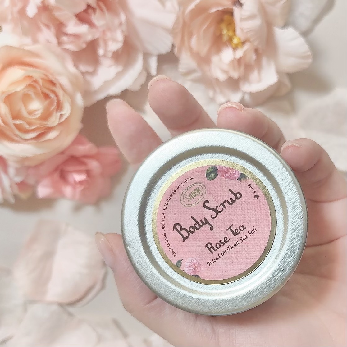 SABONボディスクラブ60gローズティー【キャンディのようにあまーいローズの香り🌹】手のひらサイズの60g購入1回に使う量や部分によりますが約2〜3回分すっきりとしたローズなイメージでしたが、あまーい可愛いローズのお菓子のような香りなのも気に入りました大きいサイズ買ってもよかったかも💗スクラブはジャリジャリします優しくなでるようにぬります保湿もされるのでいい#sabon(サボン)#ボディスクラブ