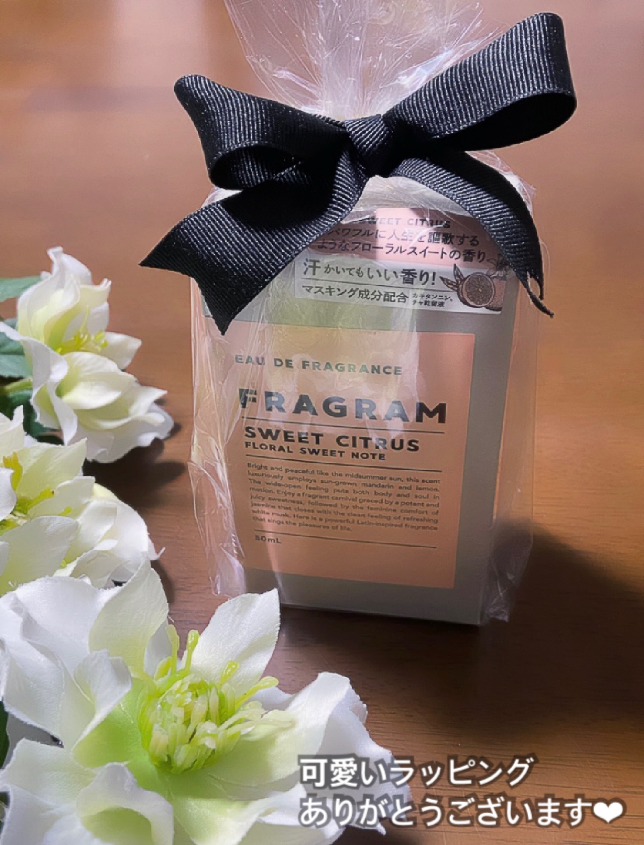 FRAGRAMオードフレグランスSWEETCITRUS🍋プレゼントキャンペーンにて当選しました!TOP:マンダリン、レモンMIDDLE:ネロリ、ジャスミンLAST:ホワイトムスクFRAGRAM」の香水は、すべてマスキング※成分配合。イヤなニオイを包み込んでいい香りに変えるので、汗をかきやすいシーンでも気軽に香りを楽しめるそうです!※マスキングとは「覆う」「隠す」といった意味をもち、特定の香料と不快なニオイが組み合わさることで良い香りに感じさせる手法さわやかな香りで嫌いな人はいなそうな使いやすい香水です。ボディミストみたいに軽い付け心地なのでバシャバシャ使えそう。持続時間は短めなのでつけ直しは必須かと!