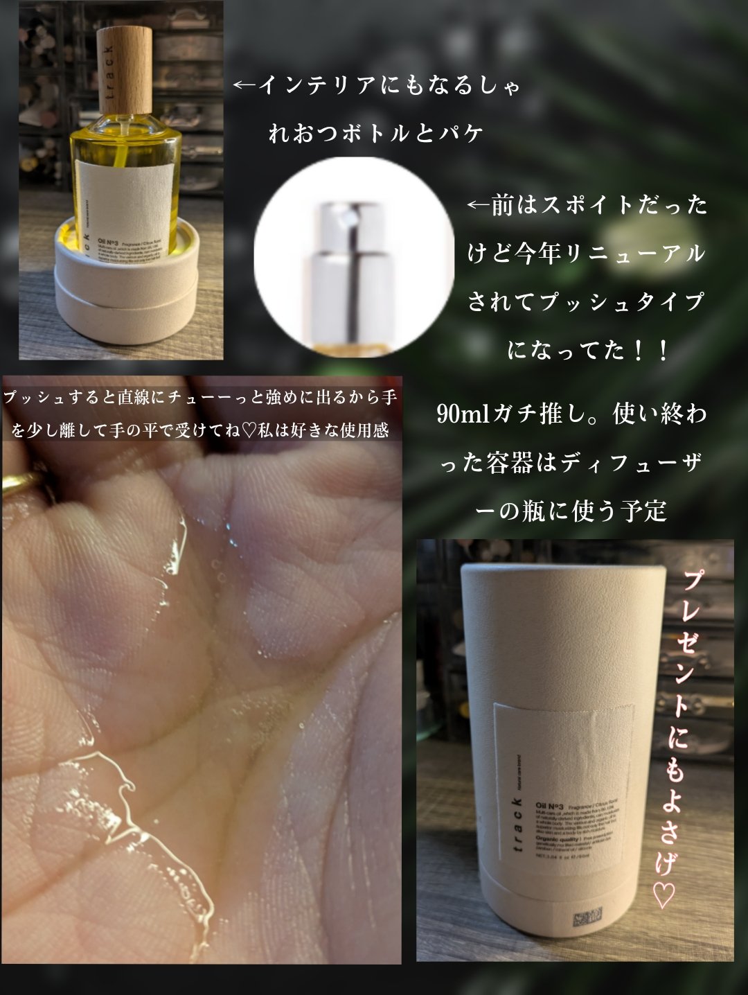 大人気のマルチオイル🤩【製品】trackトラックオイル No3内容量:90ml価格:¥4,180以前からバズっているロングセラーのマルチオイル。人気のNo3を購入しました!*シトラスフローラルの香りは、ザ金木犀!かすかにレモン🍋やラベンダー🪻...
