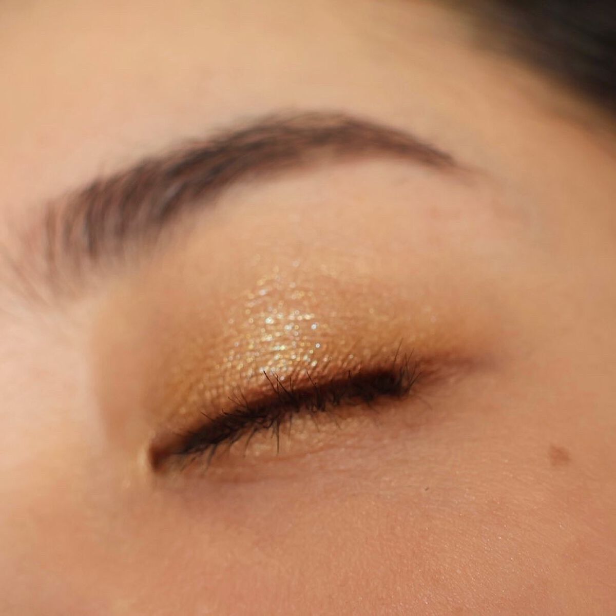 イエローゴールドに多色ラメを追加✨ ライトゴールドのメタリックをまぶた全体と下瞼に。 オレンジのマットを上から重ねる。 黒目の上にグリーンを含む多色ラメを置く。 これは自分にとって落ち着くメイク。 不安要素が全くないから悩まずにすむやつです♡ メイクで冒険するのも大好きだけど、こういうデイリーメイクも同じくらい好き✨