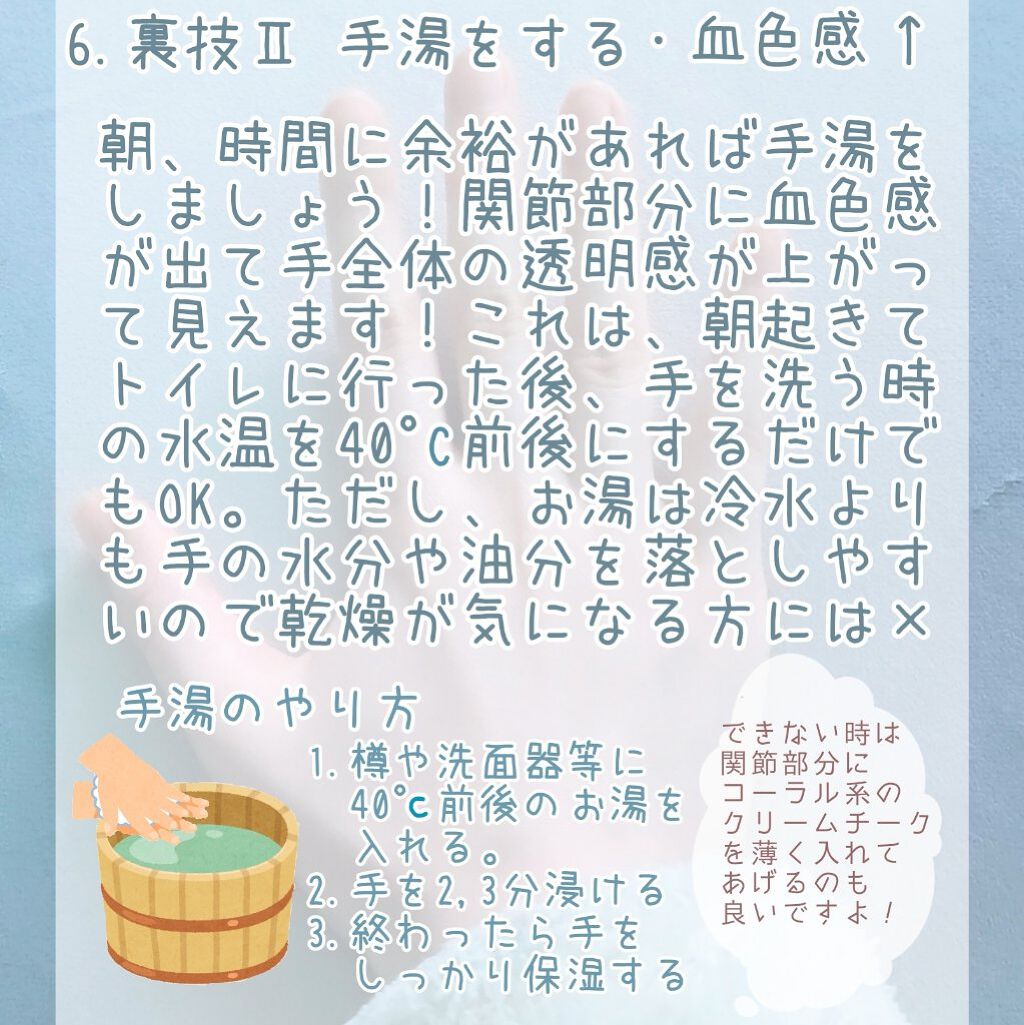 私のハンドケア方法!!/初投稿です。西洋絵画のヴィーナスみたいに綺麗な手になりたい…はじめまして。“舞”と申します🕊️今回は、この時期カサつきがちな手を綺麗に魅せる方法を、皆様にお教えしてみようと思います!!(上から目線なようですみません🙏💦)初めての投稿でわからない事も多いですが、どうか温かい目で見ていただけるとありがたいです🙇┈┈❇❇❇┈┈┈┈❇❇❇┈┈↓この時期でも透明感を出す為のハンドケア方法↓1.こまめにハンドクリームを塗る2.毎日、しっかりと日焼け止めを塗る3.指先にはネイルオイルを使う4.マッサージをする・手首をよく回す5.裏技Ⅰ6.裏技Ⅱ7.裏技Ⅲ8.普段から気を付ける事※それぞれの詳しい説明は画像の中で行っています。┈┈❇❇❇┈┈┈┈❇❇❇┈┈どれもあまり難しい事ではないので、意識しながら生活してみてください!!毎日続けると、今より透明感のある綺麗な手になれること間違いなしなので、是非参考にしていただきたいです𓂃𓈒𓏸︎︎︎︎#はじめての投稿#ハンドケア#第一印象UP作戦#手を綺麗にする