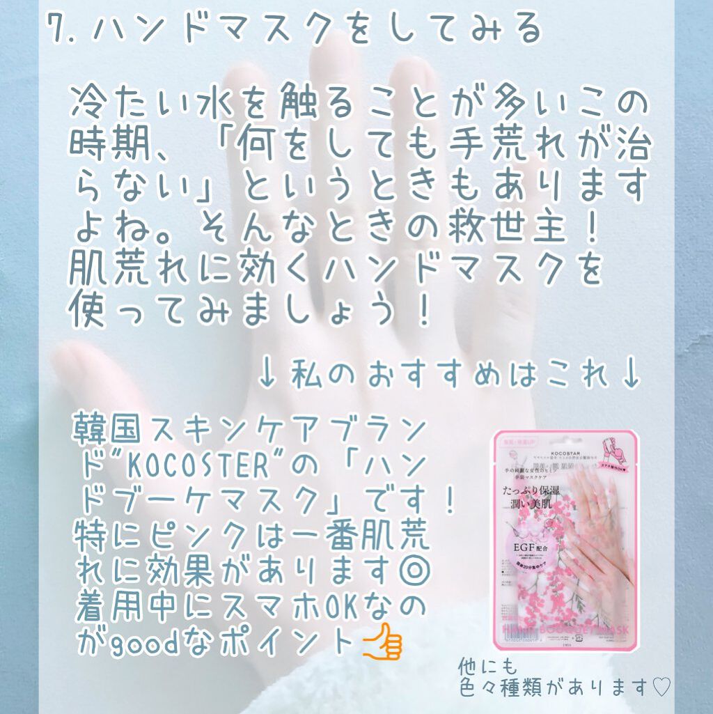 皆さんこんばんは♪今日は乾燥してしまってる手にぴったりのケア商品を紹介したいと思います!——————💖💖💖💖💖💖💖💖💖💖——————ココスターハンドブーケマスクピンク(ピーチバニラの香り)¥330(税込)⭐️特徴⭐️ ・韓国で作られてる乾燥ケアハンドマスク ・全部で5種類ありそれぞれに機能がある。 ・このハンドブーケマスクは日本限定商品であり かわいいミモザ柄のハンドマスク💐 ・手袋の中に保湿液が入っていて20分放置する。 ・手袋していてもスマホやタブレットを触れるの で便利✨ ・保湿が終わったら洗い流し不用で残った液を 手に馴染ませる。🌼香りの種類や機能🌼 💐ハンドブーケマスク💐 ①イエロー(フレッシュフラワーの香り) ・・・トーンアップ効果。 肌に透明感とハリが欲しい時にオススメ! ②ピンク(ピーチバニラの香り)・・・整肌、保湿効果。 肌荒れ、潤い、ハリが欲しい時に オススメ! ③パープル(バラの香り)・・・保湿、潤い効果。 プルプルモチ肌になりたい時にオススメ! ④ブルー(リリーフラワーの香り)・・・保湿、ハリup効果。肌のキメを整えたい時、ハリが欲しい時に オススメ! ⑤オレンジ(アロマブーケの香り)・・・整肌、ハリup効果。 肌を柔らかくしたい時、もちもちすべすべ 肌になりたい時にオススメ!💖感想💖 私は、毎日アルコール消毒と自転車通勤をしている ので冬の間にカサカサでハリがない手になって しまい手洗いやお風呂の時めちゃくちゃ痛かった んです...😢 ハンドクリームを塗ったりして色々保湿していまし たが改善されることなく違う商品を探していた所 こちらに出会いました。 1枚入りだったので買うか迷いましたが、5種類の 香りと機能に惹かれて選んだのはピンクです♡ ピンクは肌荒れと保湿効果に良く、甘い香りです。 手袋の中に液が入っていて冷たくてリラックスで きます。 夜、入浴後に20分間こちらを着用し、スマホなど 触ってokなので色々見てたり用事をしているうちに 簡単にケア出来る点も良いなと思いました! ケア後の手が1日でとっても改善されてとにかく 最高の手になりました😂 ピンクは保湿力が高いので毛穴も塞いでくれた気が します😊 色々な機能があり効果が高いのでとってもオススメ です💐 長くなりましたが最後まで見て頂きありがとうございました♡ #保湿 #ハンドケア #甘い香り