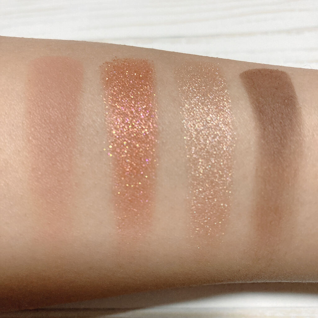 1番のお気に入りポイントは"密着度の高さ" 粉飛びせず、しっかりフィットしてくれます。 左上(マット)…ベース 左下(グリッター)…二重幅、薄づきなのでアイホール全体に塗っても◯ 右上(グリッター)…二重幅 右下(マット)…ポイント使い、アイラインのぼかし