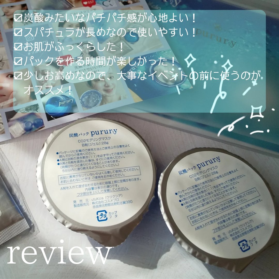 -ブランド:utuKcia(ウツクシア)商品名:炭酸パックpurury価格:¥3480(税込)/2セット注目成分:フラーレン(抗酸化作用)、EGF(ターンオーバー促進)、ヒアルロン酸(保湿)、コラーゲン(保湿)、プラセンタ(抗酸化作用、保湿、抗炎症作用、美白、ターンオーバー促進)-------------------------------------------------洗い流し不要!塗って待つだけ新感覚炭酸パック🫧✔️モンドセレクションで3年連続最高金賞獲得👏✔️楽天ランキングで1位を獲得したことも👑使用方法は付属のA剤にB剤を入れ30秒かき混ぜて顔に塗り20分待つだけ👌塗ったまま放置できるから待っている間に他のことができる◎塗る時のコツはなるべく均等に肌が少し透けるくらいの厚みで広げること💡端だけ厚みが出たりすると固まるのに時間がかかります💦剥がす目安は白っぽさがなくなり透明になる頃✨使用後は炭酸効果で血行が良くなり肌の色がワントーン明るく、そして保湿成分のおかげでモチっと弾力があるお肌になったような☺️そして個人的にはスキンケアがいつもより浸透良く感じました🌱お手軽にお家で質の高いケアが出来る嬉しいアイテムでした♪一回あたりのお値段は割と高めなので継続して使用するのが難しそうということでリピートはなしです△-------------------------------------------------#PR#utuKcia#炭酸パックプルリ#プルリ#purury#ウツクシア#炭酸パック#スキンケア#炭酸美容#保湿ケア#アラフォースキンケア#自分磨き#おうちエステ#monipla#utukcia_fan