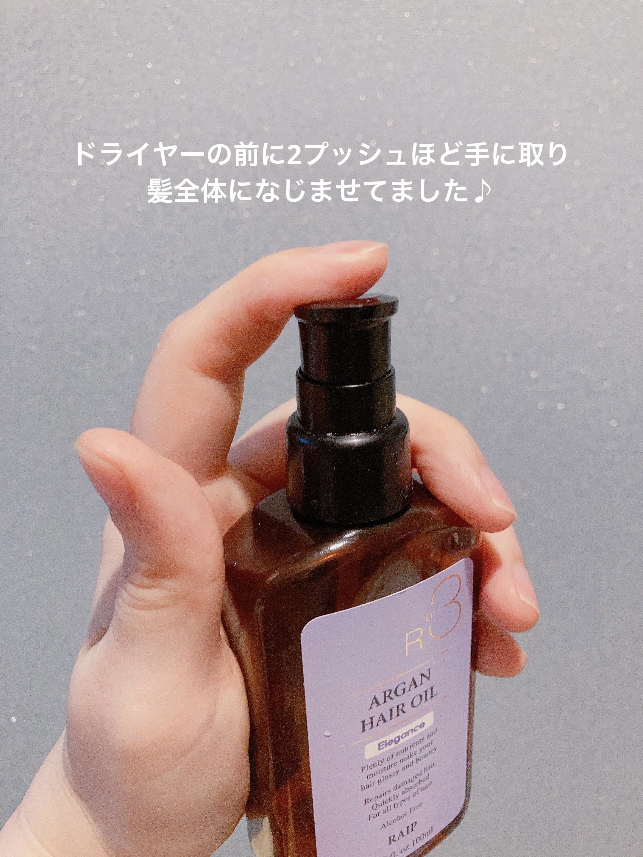 RAIPR3アルガンヘアオイルです香りはELEGANCE✨比較的サラサラめなテクスチャーでベタつきは少なめ✨仕上がりはしっとりまとまるというよりもサラサラな印象です傷みが激しかったり、まとまりがいいものが好みな方だとちょっと物足りないかも💦香...