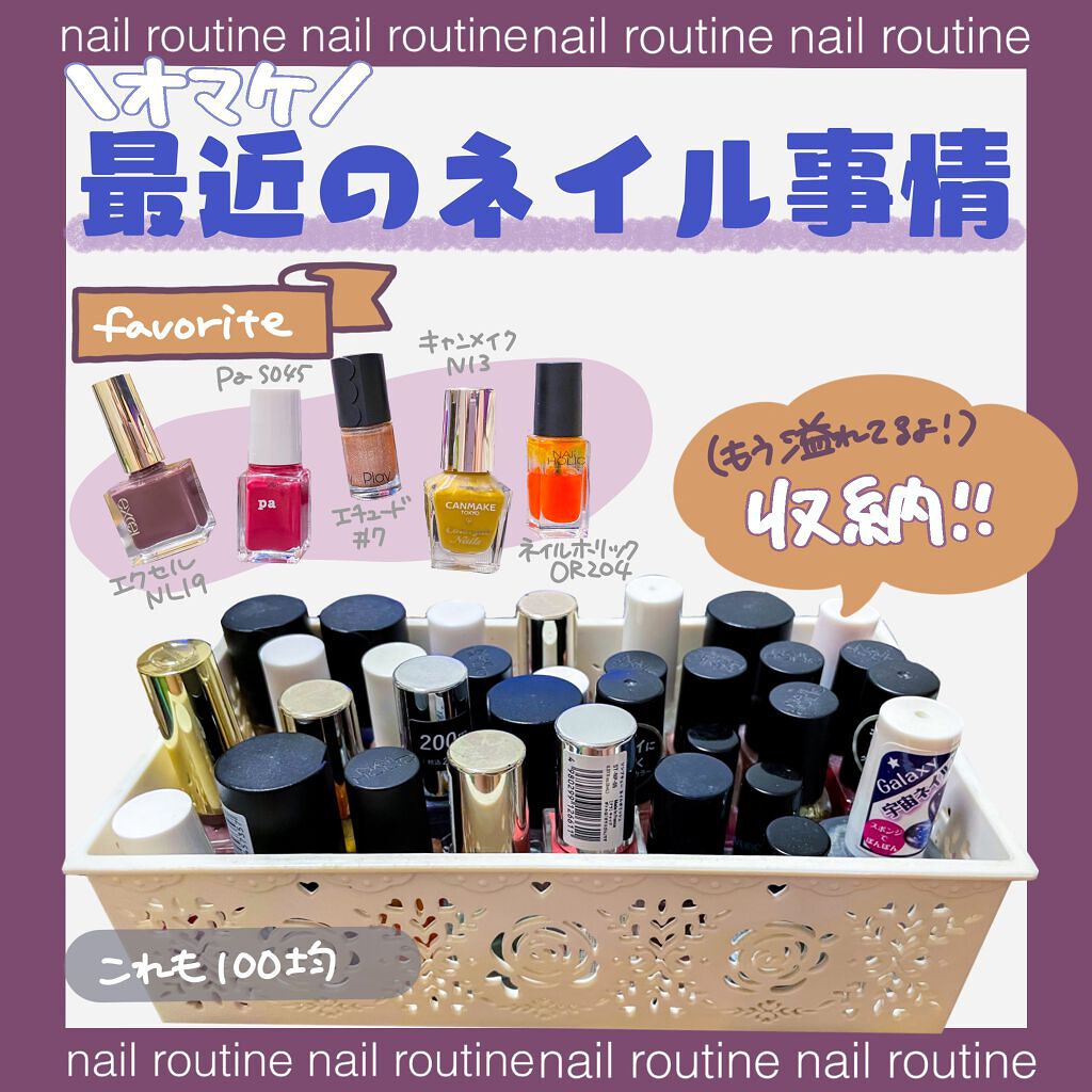 【最近のネイル事情】みなさん爪ってどうしてますか🤔?わたしはすぐにボロボロにしてしまうタイプで、素の爪があまりきれいなタイプではないです😩なおかつ伸ばすのが苦手…😢基本的にはショートネイルで楽しんでいます💅(iPhoneの画面に爪が当たったり、キーボードを打つときに爪が当たるとワーーー!!☹️☹️☹️☹️となってしまう……)そんなわたしがネイルを楽しむときに使っているアイテムたちです🙆♀️(ちなみにちゃんとしたケアはあまりしていないので、ほんとうに塗っているだけです…。ネイルオイルとかちゃんと塗らなきゃね…)💫ウィンマックスネイルケアシリーズベースコートダイソーで買えるベースコートです🥳速乾性に優れてるのですぐに次の工程にいけるところがお気に入り!爪の凹凸や色素沈着、カラーを整えてくれるのであったほうが良い1本💯💫ウィンマックスネイルケアシリーズマットトップコート秋冬に活躍するマットコート🥳マットネイルは今年初めてやってみたのですが、めちゃくちゃ可愛いかったです🥺🥺✨ラメ感のあるネイルと合わせると磨りガラスみたいになってきれいでした🙆♀️いつもと違う雰囲気を楽しみたいときに使うと良い感じ!💫ウィンマックスネイルケアシリーズクイックドライトップコートクイックドライの名の通りかなり乾くのが速いです☺️サラサラ系の液体なので扱いやすいところも好き💯💘ただ少しだけ下に塗ったポリッシュが持っていかれる感じがします😢仕上がりはツルツルというよりもペタペタとした感じ🤔速乾なので重宝していますが、別のトップコートでも良いかな………と思っています😢100均だからこうやって色々試せるのも良いところ!💫その他お気に入りネイル💅と収納3枚目の画像は収納とお気に入りネイルです🥳💘ラメを乗せてみたりマットで仕上げてみたり、いろいろ楽しめるカラーたちです😙😙✨特にエクセルのネイルはすごく塗りやすいので他の色も欲しいな〜と思っています🥰🥰💘もう少し爪の形が整ってきれいに塗れるようになったらネイルスウォッチとかできたらいいなー!と思っています😙😙💫