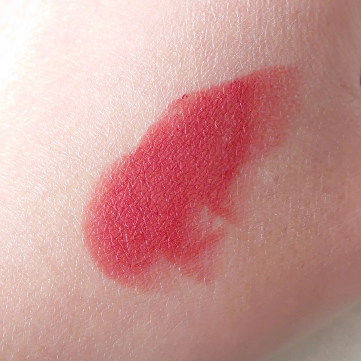 濃いめの赤なのに血色良くも見えるこのリップはブルベさんにおすすめ! しっとりめのマットなので怯えてリップクリーム塗ったら完全にツヤになったよ! 甘いチョコの香りに癒される〜 くまさんがとっても可愛いリップです!
