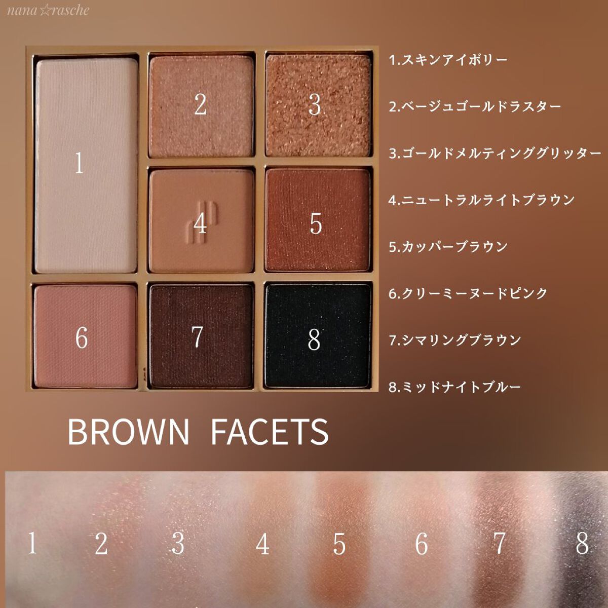 ドットオンムードアイパレット 02ブラウンファセットはソフトマット3色(1、4、6)シルキーシマー3色(5、7、8)グリッター(2)、メルティンググリッター(3)各1色の8色アイシャドウパレットです。※私の持っているものはリニューアル前の旧パッケージです。現在はパッケージかリニューアルされています。粉飛び、ラメ飛びも特に気にならず発色は淡め。ラメがザクザク、ギラギラじゃないのでどの色も普段使いやすいのが気に入っています。なんといってもミッドナイトブルーのラメがとても可愛いのですが私の写真じゃ上手く伝えられないのが残念。#韓国コスメ#LIPS投稿アワード1000万DL記念