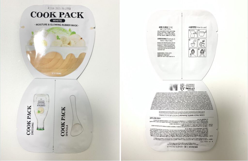 こんにちは!最近猛暑+梅雨にエアコンの風による乾燥感まで肌が敏感になる時期ですよねコロナによって皮膚科も安心していけない状況...ホームケアに気を使っていると思います。簡単で効果の良いホームケア商品をお探しですか?久しぶりにとても良い商品を持ってきました:)水分,弾力,鎮静全て掴んでくれるイッタンクックパックザフレッシュラバーマスクですイッタンクックパックザフレッシュラバーマスクRED/WHITE容量:33.75g普通家でモデリングパックをしようと思ったら使用法も複雑で準備するものが多くて手が行かないきがします:(イッタンクックパックは容器として使用可能なスタンディングポーチの中に1回分のモデリングパックとスパチュラーが内蔵されていて道具準備必要なく簡単に使用できます!イッタンクックパックホワイト使用法は商品後ろ面に細かく書かれています!簡単に説明すると切り取線に沿って1剤、2剤、スパチュラーを分離した後スタンディングポーチ下面を広げボール状態にした後1剤と2剤を入れて約1分間スパチュラーで早く混ぜて顔に塗布した後20-30分待って剥がしたら良いです:)1剤と2剤全て粉じゃないゲルタイプなので綺麗に使用出来ました。力を入れなくてもまんべんなくよく混ざってとても簡単でした!若干敏感な乾燥肌なのでパックを間違えて使用したらより刺激になります。だけどイッタンクックパックは違いました...!重くて硬い既存のモデリングパックとは違って水分感がたっぷりな感じでモチモチ,しっとりしたゲルテクスチャーでした。おかげで下手くそな私も簡単に早く塗れました:)塗ってすぐクーリング感が冗談じゃないです。肌熱感のせいでぬるくなると思ったけど何分過ぎても涼しくしっとり塗布後30分後に剥がします。髪、眉毛にくっつかなくて綺麗に剥がれるのが本当に楽で良かったです!特にクックパックホワイトは水分,艶がポイントでくすんで活気を失った肌に明るくしっとりさせてくれるのに優れた商品です‼メイク前に使用したら肌化粧ノリが良くなる感じです。卵、キャベツ、カリフラワー、ジャガイモ、バナナ、キノコまで肌保湿、コンディショニングに良いホワイトフード成分がたっぷり入った商品なので肌タイプ別に負担なく使用出来そうです。滑らかで弾力のある肌を作ってくれるクックパックレッドも使用してみました:)商品容器だけカラフルだと思ったけど内容物もおじカラフルなのがとても面白かったです。イチゴジャムのようなカラーに香りもイチゴのような果物の香りで一口食べたくなりました1剤と2剤を混ぜた後顔にまんべんなく塗布します。レッドもやっぱり水分感が凄くてホワイトより若干もちもちした?栄養、保湿感が多い感じでした!確実に乾燥した肌に弾力感が出来たのが感じられました。若干の美白効果もありました!日によって肌状態によってカラー別に多様に使用出来そうです:)クックパックレッドはザクロ、トマト、イチゴ、パプリカ等レッドフード成分が含有されたパックで乾燥して弾力を失った肌を丈夫に管理してくれるそうです!乾燥,老化肌にぴったりです。
