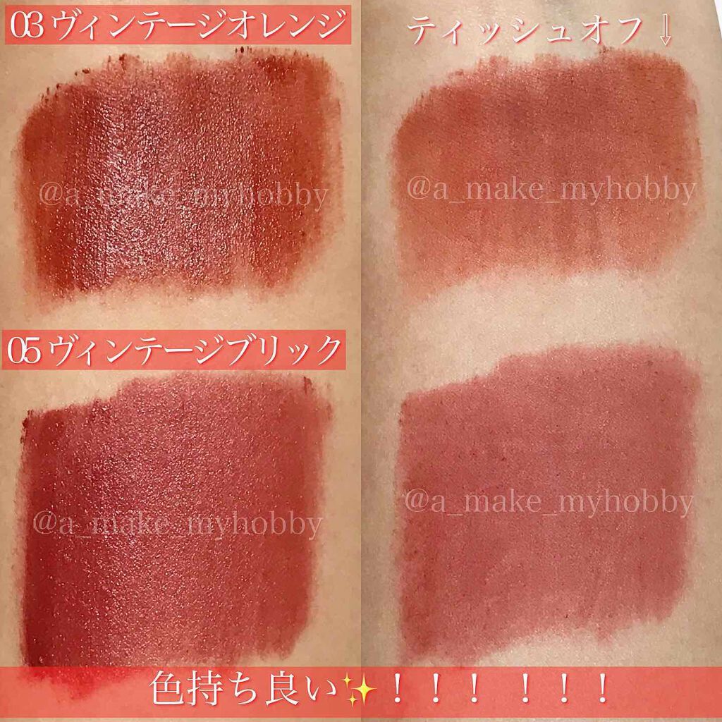 イーグリップスベルベットフィットティント03ヴィンテージオレンジ🍊05ヴィンテージブリック🧡ヴィンテージカラーのこのシリーズ、ずっと探してたマットでオレンジブラウンなリップだったので買ってみたら可愛い色でした!塗る時はふわふわムースな感触で、...
