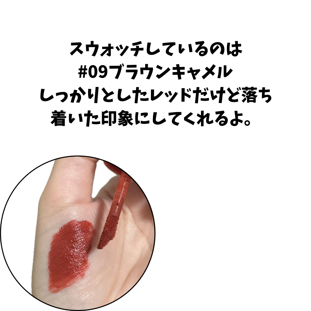 ふわっとしたスフレのような質感のマットタイプ💋 ティントタイプで色持ちも◎ 直に塗ると結構濃いめに色づくので、指に少しだけ取ってぼかしながら塗るのがおすすめ🤏🏻 今回お試しした09はブラウン系のこっくりとしたカラーでイエベ秋の私にはぴったりなカラーでした🍁