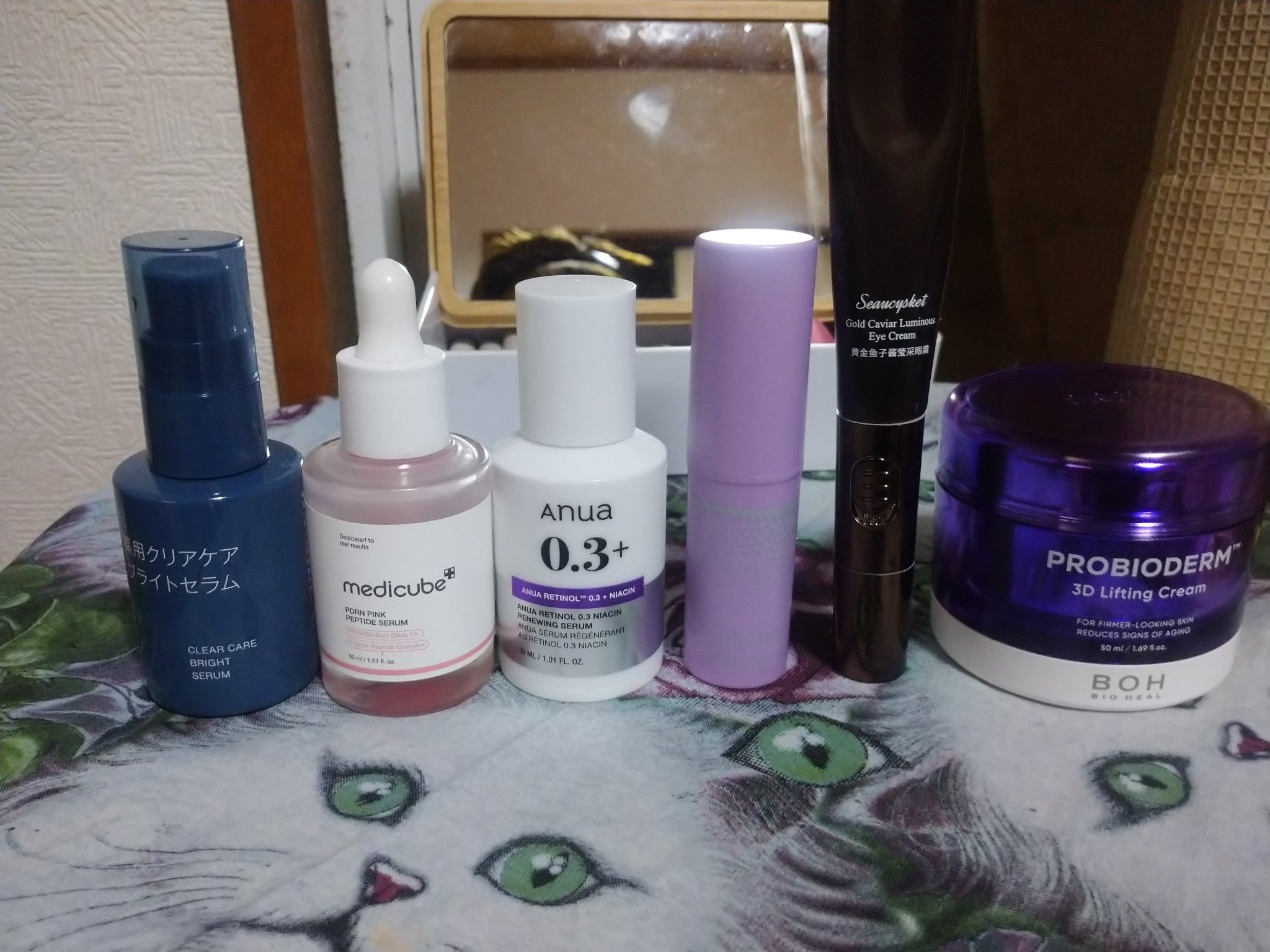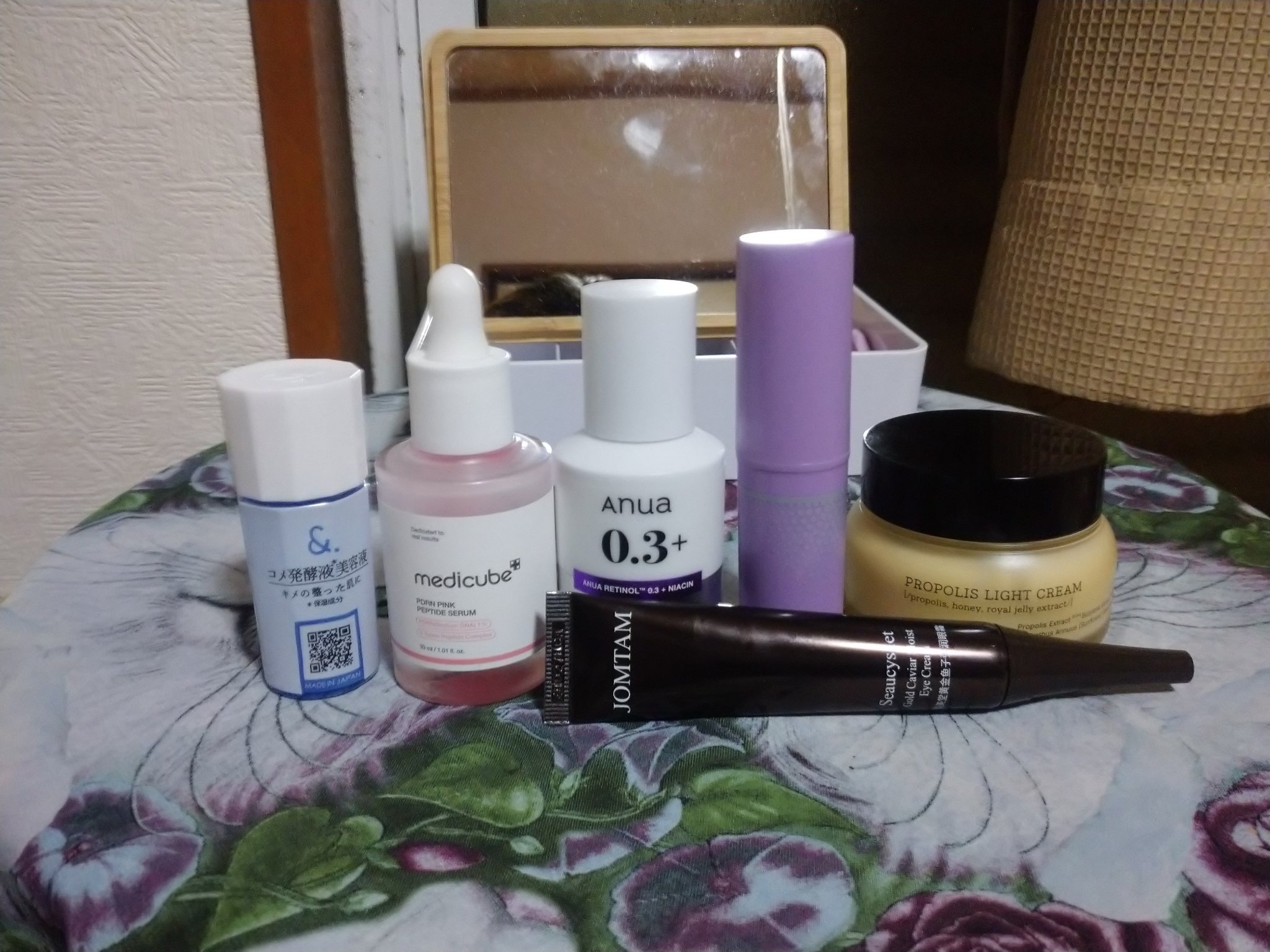 洗顔➔COSRXRXザ・6ペプチドスキンブースターセラム➔Dr.GRTXセラム ぺプチショット➔Stay FreeSUHADA べっぴんますくヒト幹細胞順化培養液➔COSRXフルフィットプロポリスシナジートナー 無印良品薬用クリアケアブライトセラム、Anuaレチノール0.3 ナイアシンリニューイングセラム➔LIF THENG アイマスク Dinkiss リンクル棒、BIOHEAL BOHプロバイオダーム™3Dリフティングアイ&リンクルクリーム➔COSRXフルフィットプロポリスライトクリーム