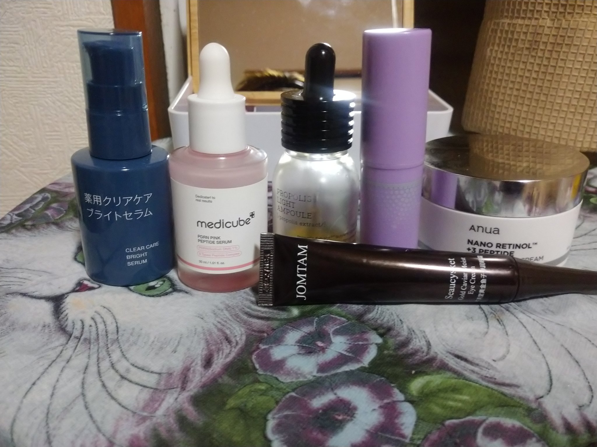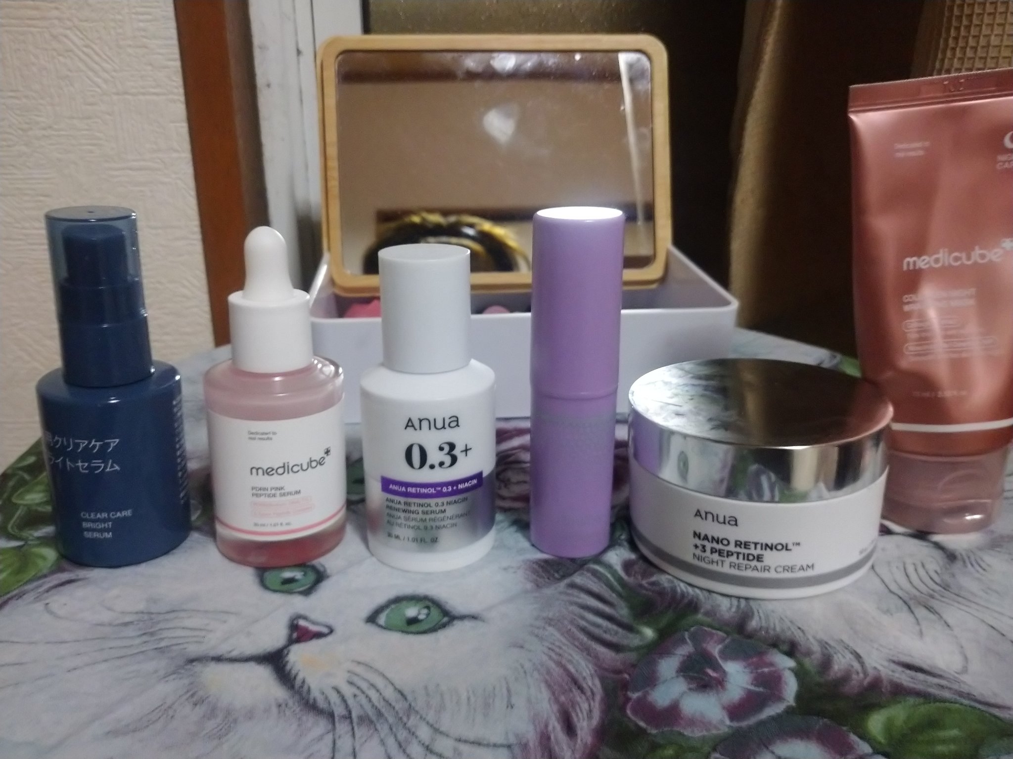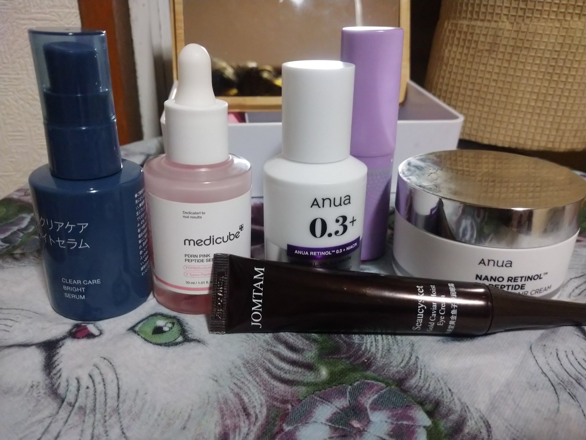 🌃夜のスキンケア記録用Dr.GRTXセラムぺプチショット➔StayFreeSUHADAべっぴんますくヒト幹細胞順化培養液➔ナチュリエハトムギ化粧水ナチュリエスキンコンディショナーR、Dr.Ceuracleヴィーガンコンブチャティーエッセンス➔無印良品薬用クリアケアブライトセラム、MEDICUBEPDRNピンクアンプルPDRN10,000ppm配合、Anuaレチノール0.3ナイアシンリニューイングセラム➔DinKissColor:M01#リンクル棒*、JOMTAM黄金キャビアアイクリーム➔Anuaレチノール3ペプチドナイトリペアクリーム