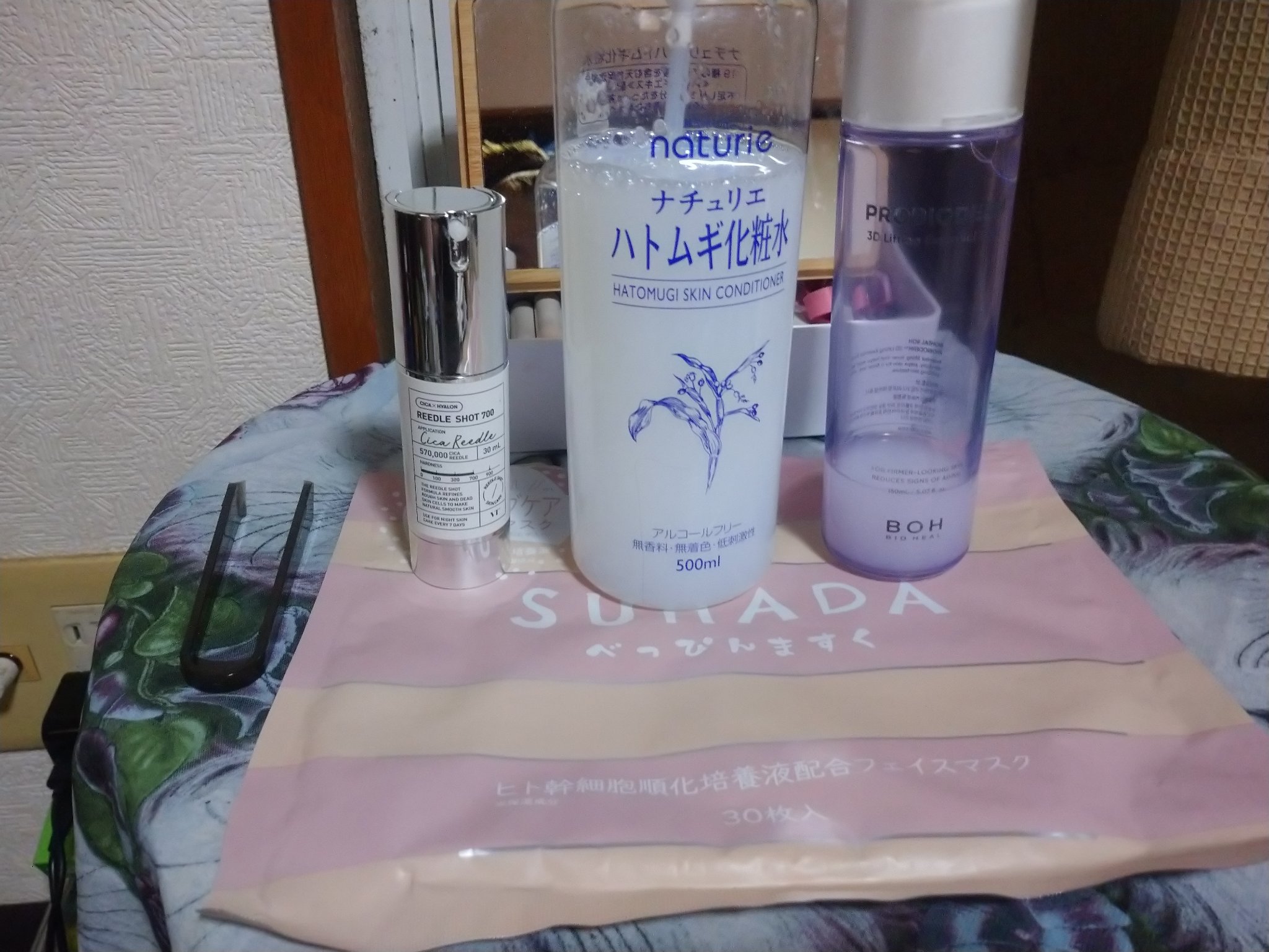 洗顔➔VTリードルショット300➔Stay FreeSUHADA べっぴんますくヒト幹細胞順化培養液➔ワンシングニンジントナー、BIOHEAL BOHプロバイオダーム3Dリフティングエッセンシャルトナー➔Anuaシラカバ70%水分ブースティングセラム Anuaレチノール0.3 ナイアシンリニューイングセラム➔ドン・キホーテHYDROGEL EYE MASK、BIOHEAL BOHプロバイオダーム リフティング アイリンクルクリーム➔Anuaシラカバ水分ブースティングクリーム