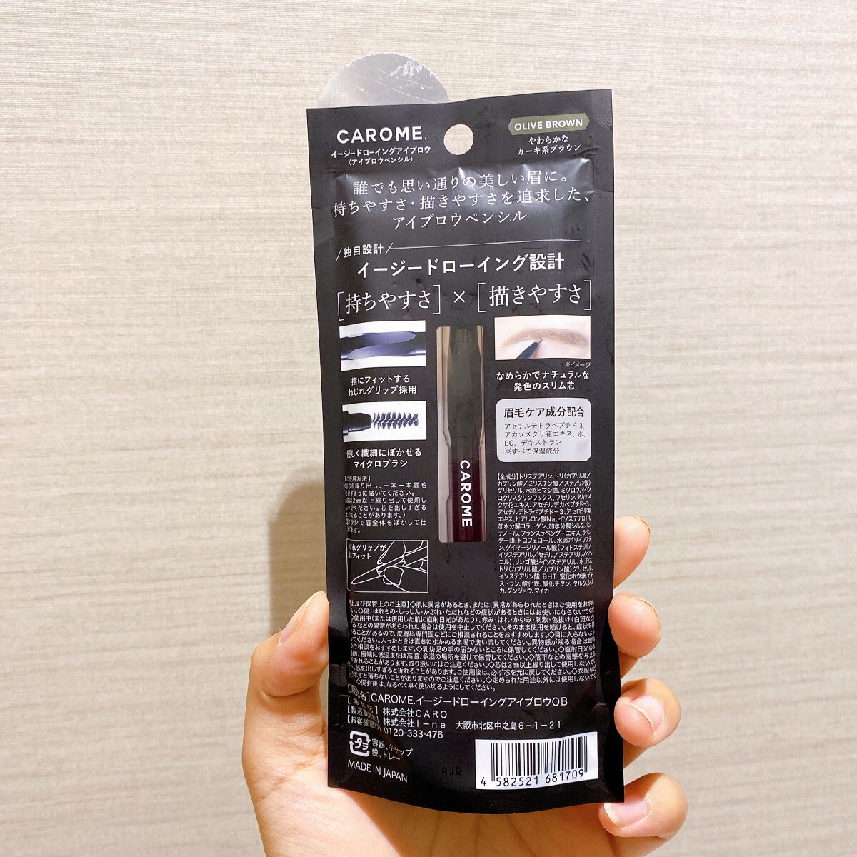 CAROME.イージードローイングアイブロウ/オリーブブラウン やわらかなカーキ系ブラウン秒で美眉 ダレノガレ明美プロデュース持ちやすさ×描きやすさ私は、ブレない誰でも思い通りの美しい眉に持ちやすさ、描きやすさを追求したアイブロウペンシル持ちやすさ指にフィットするねじれグリップ採用優しく繊細にぼかせるマイクロブラシ描きやすさなめらかでナチュラルな発色のスリム芯芯を出しすぎると折れるので注意!眉毛ケア成分配合アセチルテトラペプチド-3アカツメクサ花エキス 水 BGデキストラン