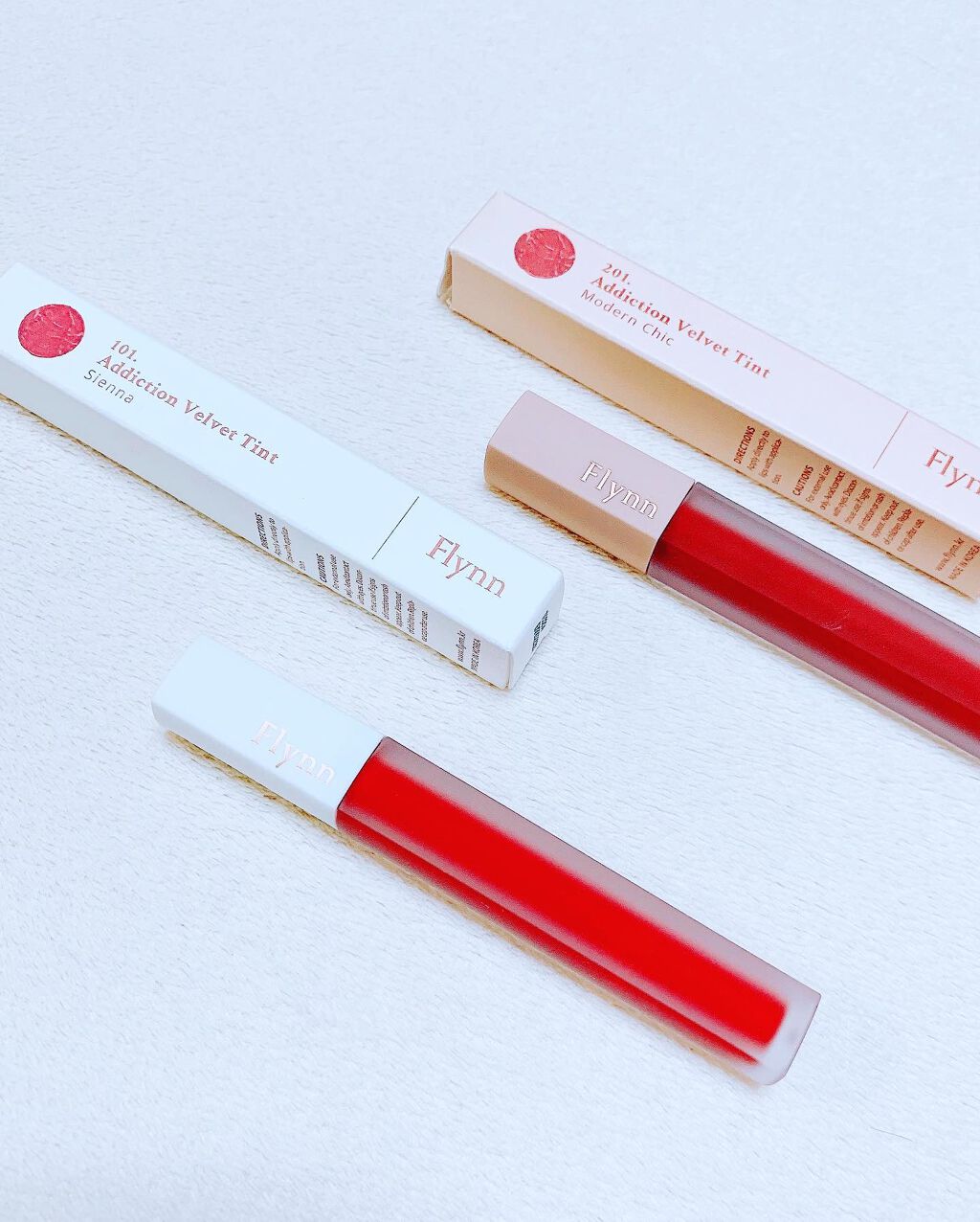 ✼••┈┈••✼••┈┈••✼••┈┈••✼••┈┈••✼🌹𝑭𝒍𝒚𝒏𝒏🌹✾AddictionVelvetTintアデイクションベルベットティント(全12色)201#ModernChicモダンシック𖧧青みのあるデイリーレッド𖧧見た目は少し暗めの赤だけど唇に乗せたら肌馴染みがよくて誰にでも似合うレッドだと思う❤️101#Siennaシエナ𖧧透明感のあるフレッシュなレッドカラー𖧧明るいレッドで韓国女子が良くつけてるカラーに見えます👆✨少しオレンジ寄りな感じで元気で可愛いイメージ❤️ふわっとした質感で塗ってないみたいに軽い塗り心地のマットリップ。発色がとても良く一度塗りでしっかり色が乗ります。塗った瞬間にピタッと密着するのに指でポンポンとぼかしやすいので色の調節がしやすいです👌✨ふんわりしたテクスチャーなのに唇の縦皺にしっかり入り込む濃厚さがあり、色が乗りにくい唇の内側の粘膜もしっかり埋まるのは初めてかもしれない🤭💕ティッシュオフするとマスクをしても落ちにくいし乾燥もしない優秀ティントでした☺️始めは香りが強いかもって思ってたけど塗ると気にならない程度で味が無いのも高ポイント👌✨マットだけどティッシュオフした後にグロスを付けても可愛い色味になるよ💖⁎⁎⁎⁎⁎#flynn#フリン#アディクションベルベットティント#ティント#ティントリップ#マットリップ#リップ#LIPS#韓国#韓国コスメ#韓国コスメ大好き#韓国コスメ好きな人と繋がりたい#コスメ#コスメ好き#メイク#メイク好き#美容#美容好き#美容好きな人と繋がりたい#美容好きさんと繋がりたい#赤リップ#パケ買い至上主義#期待越えコスメ#雰囲気美人flynnアディクションベルベットティント✼••┈┈••✼••┈┈••✼••┈┈••✼••┈┈••✼
