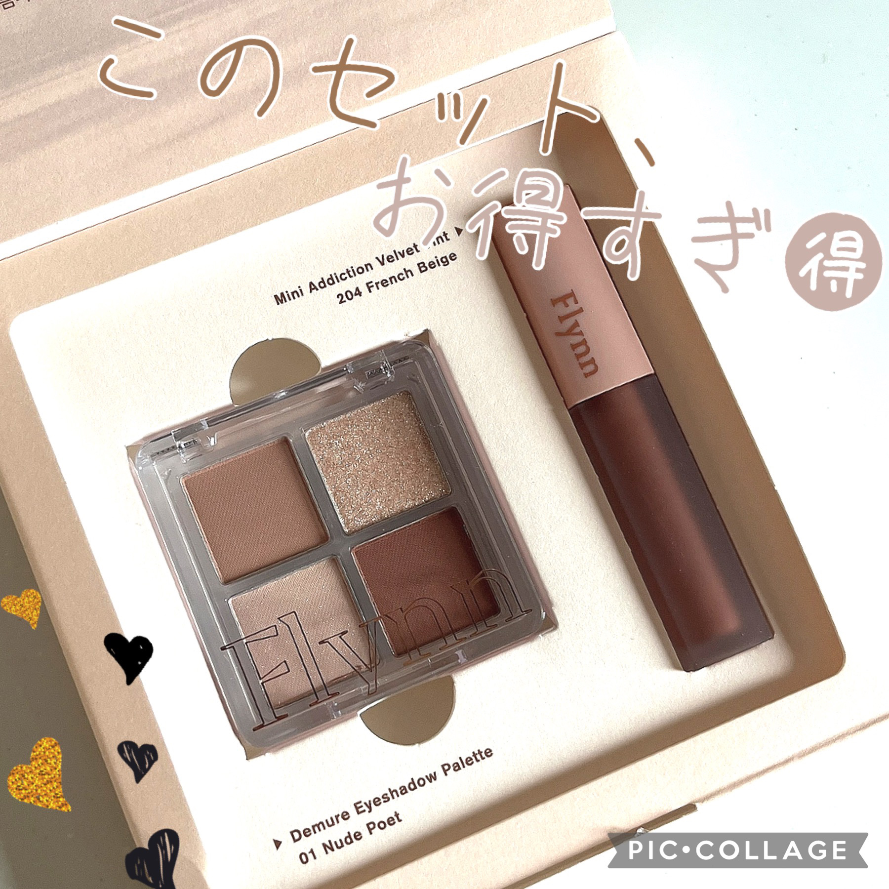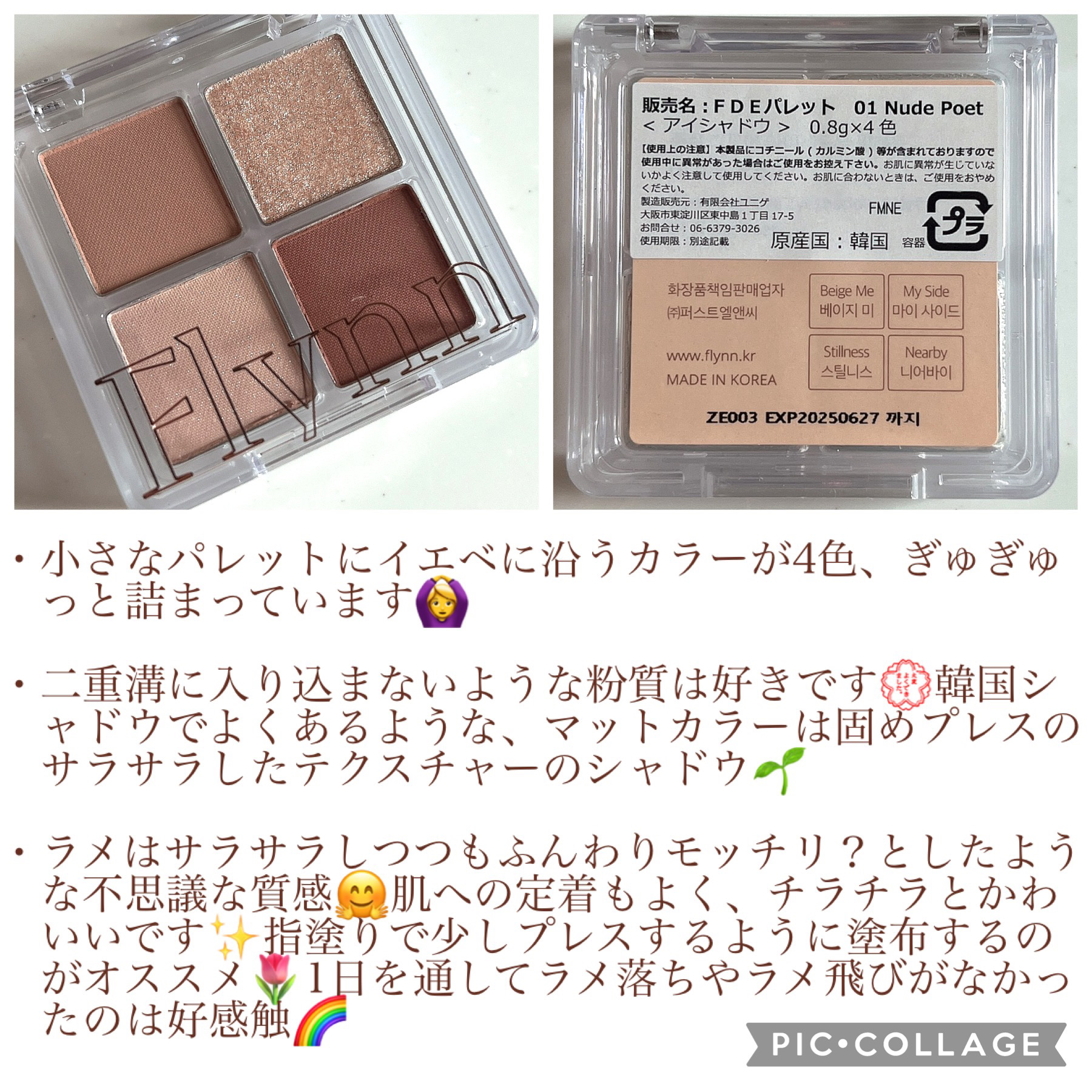 🌈このセット、お得すぎ🉐🌈ご覧くださりまして、ありがとうございます🌱本日はLIPSショッピングで見つけた、お得なセットについて👀元々気になっていて、少し前にQoo10で見たことのあったこちらのセット💫よくよく探してみたら、なんとLIPSショッピング内に扱いがあり、歓喜のままポチり💸結論から言って、このマットリップに出会えた喜びは2200円の金額以上ーー😍😍😍人生一、使い心地の好きなマットリップに出会えました🌈もちろんアイシャドウも使用してみましたので、そのあたりも含めて以下にてレビューを📝📝早速ですが、以下にて✨🍂🍂🍂🍂🍂🍂🍂#Flynn#FDEパレットオススメ度★★★☆☆《使用レビュー》⭕️小さなパレットにイエベに沿うカラーが4色、ぎゅぎゅっと詰まっています🙆♀️⭕️二重溝に入り込まないような粉質は好きです💮韓国シャドウでよくあるような、マットカラーは固めプレスのサラサラしたテクスチャーのシャドウ🌱⭕️ラメはサラサラしつつもモッチリ?としたような不思議な質感🤗肌への定着もよく、チラチラとかわいいです✨指塗りで少しプレスするように塗布するのがオススメ🌷1日を通してラメ落ちやラメ飛びがなかったのは好感触🌈⭕️このラメ、油断するとクレンジングしても残っているくらい高密着です🤣❌カラー系の発色は弱めかもです💦私がイエベ秋で濃いめアイメイクが好きってこともありますが、あまりにふんわり発色すぎてマットは1番濃い焦茶以外使わない…😳🔺色定着もほどほど📝普段アイシャドウベースを使わなくても高発色なシャドウを持っている分(高発色シャドウのオススメはハートパーセント👀🎨)、Flynnはもともとの発色も弱く、単品使いで夕方に色が飛んでたりします😭夕方からの出かけなど短時間に💡⭕️とはいえマットカラーならアイブロウパウダーとしても使えるので、旅行や出張など荷物を減らしたいときにシャドウ兼アイブロウとして役立ちそう👌🍂🍂🍂🍂🍂🍂🍂#Flynn#アディクションベルベットティント#204フレンチベージュオススメ度★★★★★《使用レビュー》⭕️思ったほど黄色味もなく(イエベ秋の唇でも黄土色っぽくならない!)、血色を奪わないようなコーラルベージュでかわいいです✨重ねても茶系カラーに寄ったりせず、濁らせすぎないシックなコーラルカラーで万人ウケしそう😍⭕️縁をぼかして、ぽわわんとしたマットリップメイクが簡単に出来るのも良き🌷塗布後すぐでと、紙ストローや紙コップに付きにくいところも推せます👍⭕️平たくて細めの起毛チップが塗りやすい💯初めこそ多くリップ液がついてしまいますが、チップがしなる為ボトル口でしごいて調節しやすい🙆♀️⭕️色定着もしっかりあります🌱やや粉っぽい定着で、重ね塗りをすると縦皺には入りこみやすいところはありますが、食後も均等に色残りがするのが優秀です🥰⭕️乾燥しにくいのも驚きました!!まだ夏場なのもありますが、朝から夜まで2〜3度塗り直しても唇が乾く感じなし👌クリオのシフォンマットリップ使用歴あり、それみたく唇から水分を奪うようなあの感覚は感じにくい👀⭕️ミニサイズがまた👍このセットならではのサイズではありますが、マットリップって使い切れたことがないので、これなら小さめで使い切れそうって思いました😆何よりカバンにも忍ばせやすいです🌷🔺桃っぽい香りがあります🍑無香タイプが好きなので、香りがなければ尚良しだったなぁなんて😅とはいえ割りと早く香りは飛ぶので、匂い酔いはしにくいかと💮⭕️指紋が目立ちにくいマットな質感のボディも好きです☺️滑りにくいので開け閉めも快適🌈🍂🍂🍂🍂🍂🍂🍂以上です!トータル的にコスパのよいコスメセットかと🥰個人的にはマットリップのほうが推し感あります💐💐マットリップ、すごく気に入ったので現品買っちゃいそうーー💸なにはともあれ、ご参考になりましたら、是非いいね👍を頂けますと幸いです🙇💌頂けますと素直にとてもとても嬉しいです✨ではでは、大変長くなりましたが、最後までお読みくださりまして本当にありがとうございました🌠🌠#韓国コスメ#マットリップ#イエベメイク#イエベリップ