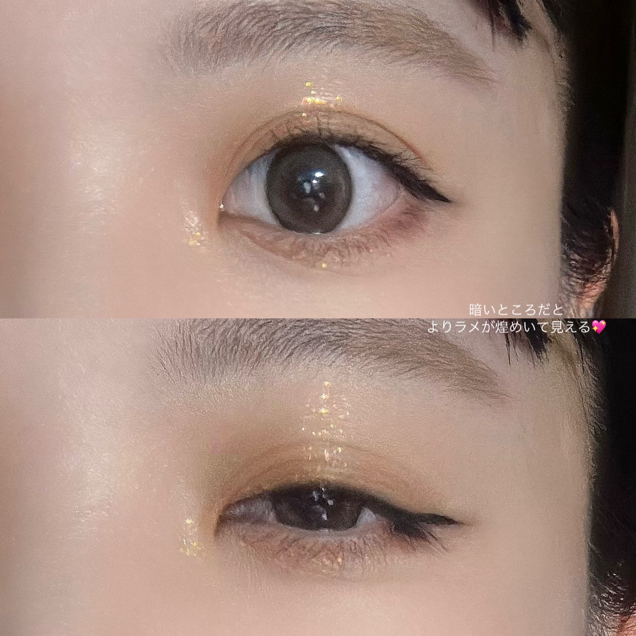 液が乾くのに少し時間がかかるけど しっかり乾かせば密着し、 長時間経ってもラメ飛びせず うるうるな目にしてくれる! 色んなサイズのグリッターが入っていて 角度によってキラキラ宝石みたいに光る #ジュエリーグリッター