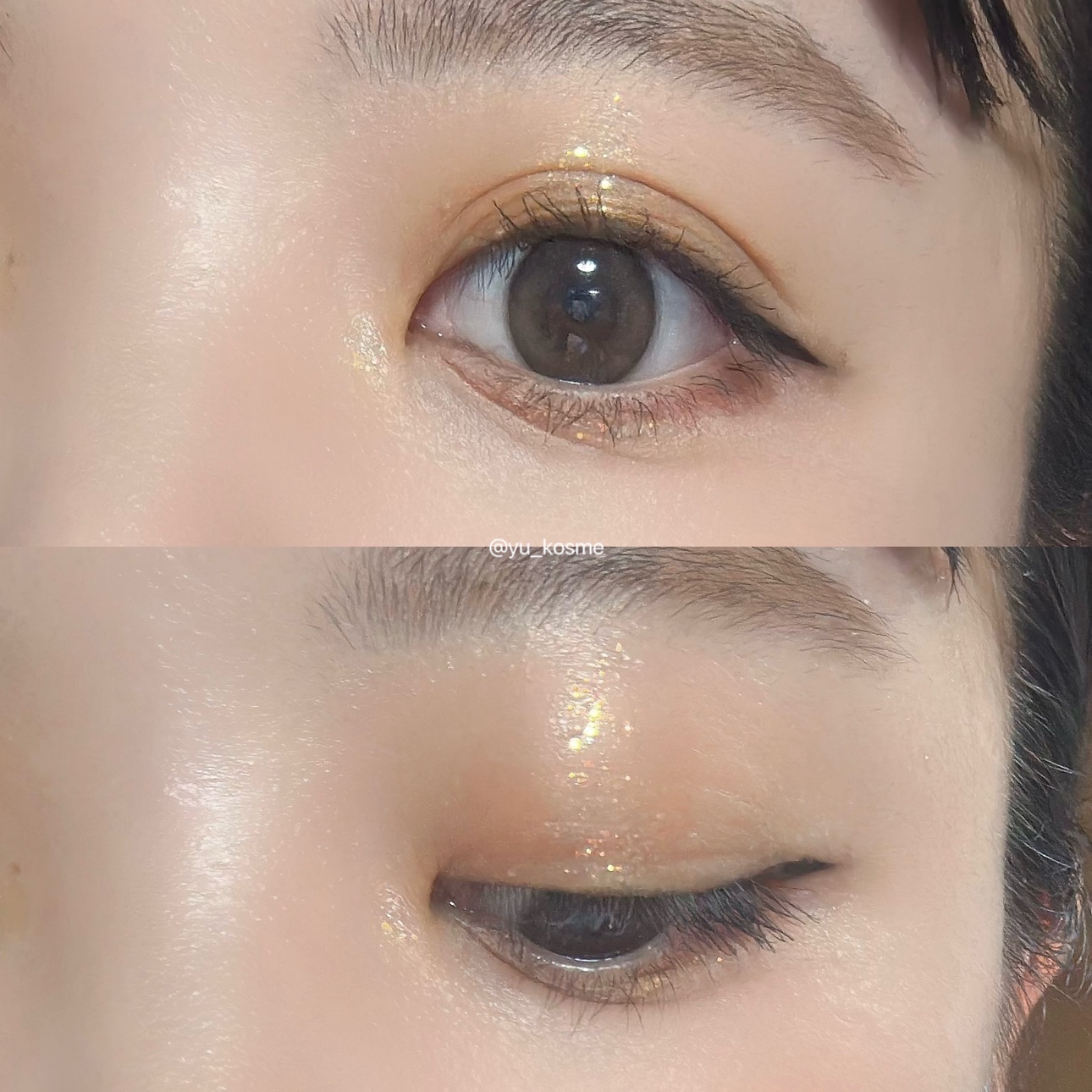 新作のウィークエンドオランジュにゴールドラメを重ねるとめちゃめちゃ可愛い! シトリンは大粒のゴールドラメで太陽に映える…! 光が当たる度にきらめくのでつい鏡を見てしまうようなグリッターです🎠 この組み合わせ最強すぎるのでやってみて欲しい…!! 目頭にもオレンジをプラスすることで離れ目解消&いつもとは違うメイクに♡