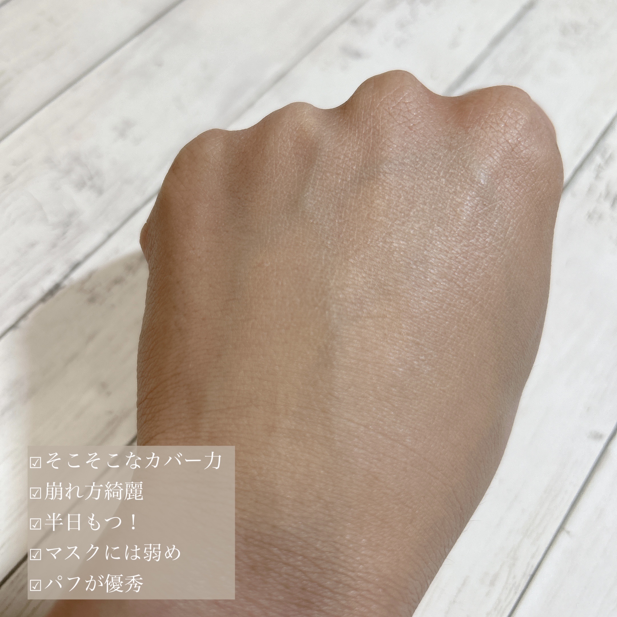 何も考えず塗布してもムラにならないみずみずしいテクスチャーでやや透け感のあるセミマットな仕上がり。 汗ばむ日でもメイク持ちが良くて、崩れ方も比較的綺麗✨️ (全体的に薄れていく感じ、大幅なヨレ・毛穴落ち無し◎) カラーは普段「やや明るめ・黄み寄り」を選んでいる方に合いそうな標準よりも少し明るめのカラーで、今の私の肌色にはピッタリでした💮💯