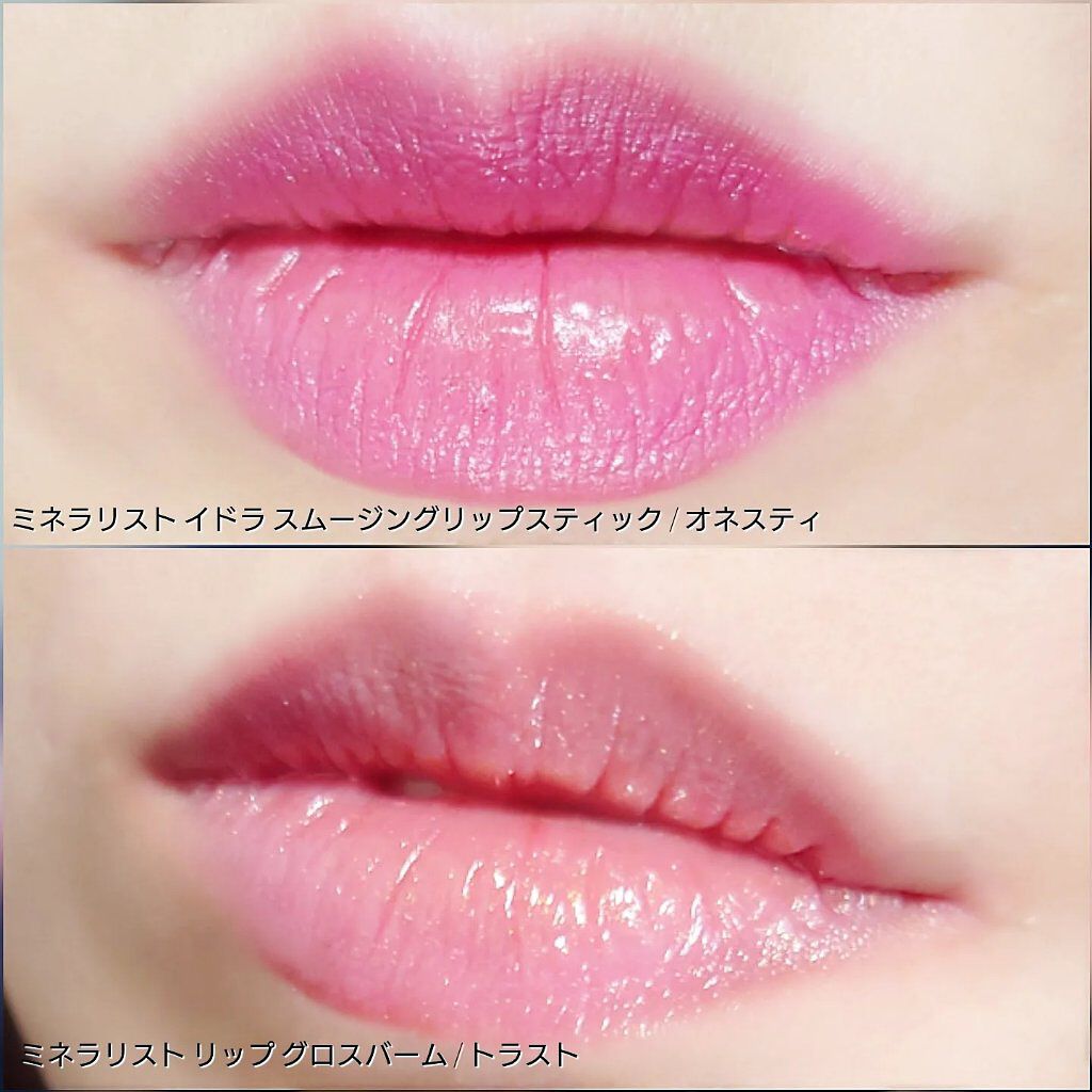 bareMineralsミネラリストイドラスムージングリップスティックミネラリストリップグロスバームいただいたものですがスウォッチです。特にグロスバーム、パール感が春らしくてとても綺麗です🤍#提供...