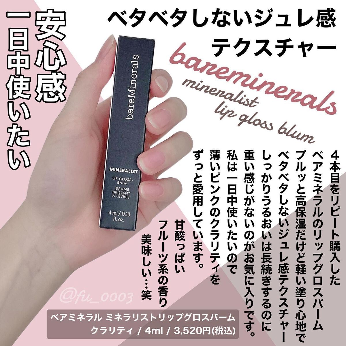 \新作✨ジュレ感リップのレビュー💋/こんばんは😊mahoですベアミネラルからジュレ感リップが新発売💄お試し3色レビューbareMineralsベアミネラルミネラリストリップグロスバーム全10色✔︎クラリティクリアなピンク✔︎トラストパール入り...