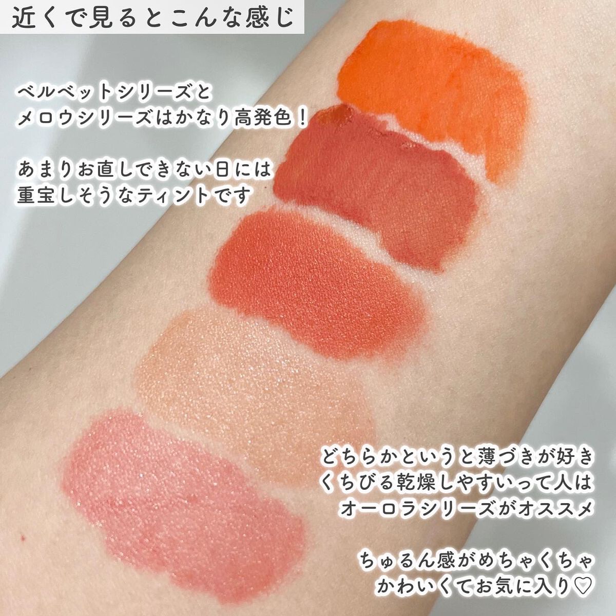 MERZYといえば、ブラウン系が多いけど、オレンジとかコーラルもめちゃくちゃ可愛い!!種類はバラバラだけど、めちゃくちゃ落ちにくくて可愛い色が多いのよ🙌💓 え!?こんなオレンジ?ってギョッとするような色でもつけたらまじで可愛かったり😇 赤リップでもイエベの似合うカラーってあるし、塗り方工夫すれば事故らない!!オーロラ デュイ ティントの色はどっちも可愛いしつやんとしてるのにマスクにつきにくくてめちゃくちゃ気に入った🧡 ザ ファースト ベルベット ティントは2色ともすごい色なんだけど、塗るのまた可愛いしベルベットだけど下にリップ仕込めばそんなにマットになりすぎないので使いやすかったよ❤️🔥