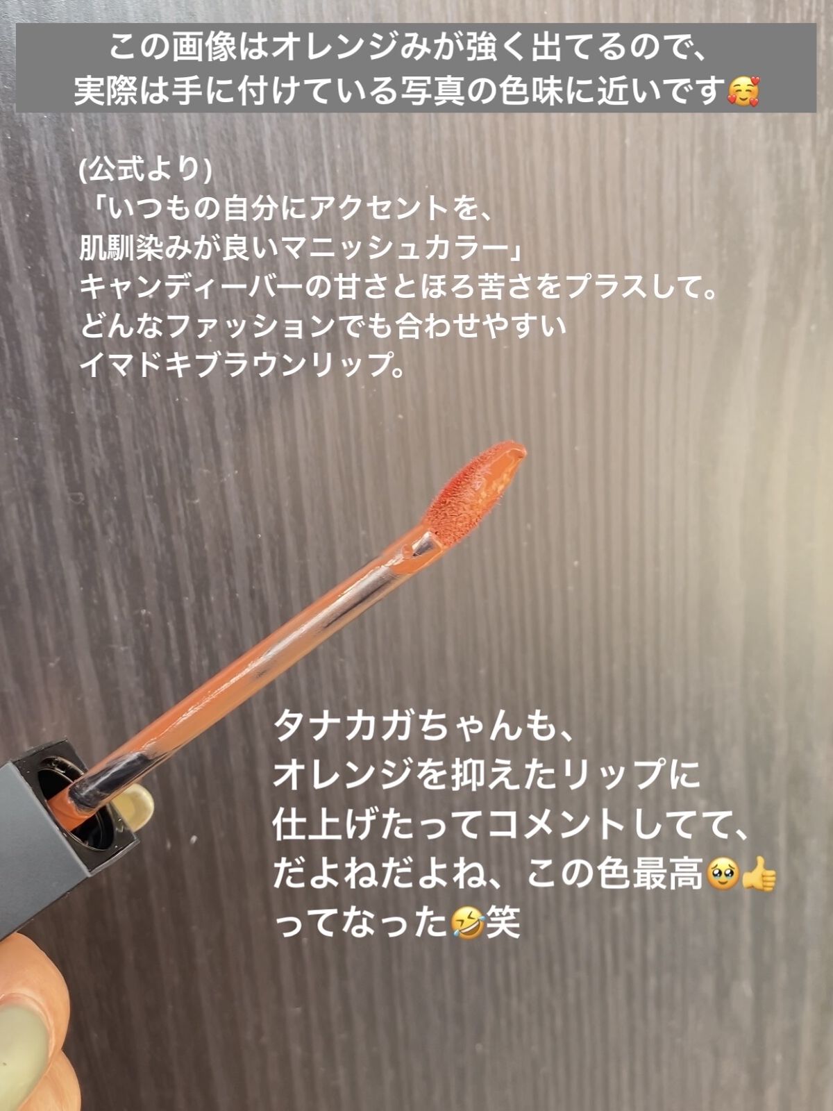 🪞オレンジブラウンなんだけど、ブラウン感強めで大好き💓 色味の持続力もあるから、なかなかお直し出来ない場面で大活躍💪 色味が落ちてきてからもブラウン感残ってて、ピンクやオレンジに傾きにくいよ🙆♀️ ツヤ感はほどほど、割とすぐ定着して、ツヤ感はどっかいくかな🤔 ブラウンリップ好き!でもがっつり暗めは…って方にすごくおすすめ🥰