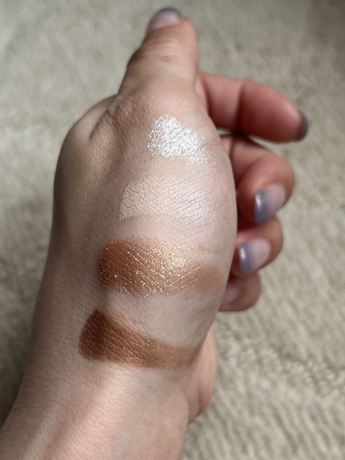 左上→ピンクやブルー等の大粒ラメ入りホワイト 右上→シルバーパール入りベージュ 左下→ゴールド、ブルー、ピンク等の大粒ラメ入りブラウン 右下→ゴールドパール入りのブラウン 左側の煌めきがやばいです〜〜〜⭐️🤩⭐️🤩⭐️ デパコスでこういうノーマルカラー×ラメのアイシャドウ欲しかったから大満足でした‼️ カラーライナー使って遊んでも楽しいだろうなと思っています💕