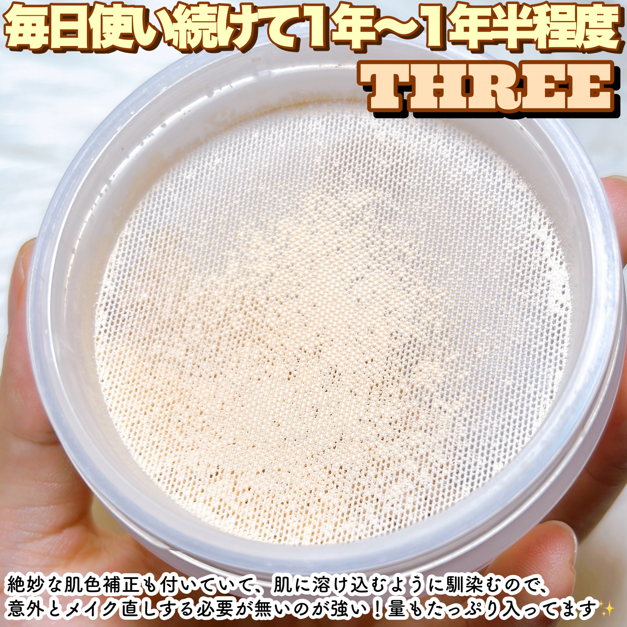 まじでオススメ なんやろ…私が追い求めてたもの 全てが詰め込まれてるって感じ 崩れにくい 厚塗り感ない けど毛穴カバー この三つが私の求めてる パウダーなんやが それを見事に叶えてくれた。 まずこのパフね ふっわふわ、もっちもち パウダーは良くてもパフが… ってことよくあるけど threeはパフまでも優秀😭💓 で肝心な使用感やけど のせてる感じほぼしない すごく軽い感じ。 けど毛穴が自然と綺麗に 見せてくれんのよ ただシミクマのカバーは ほぼないんよ ただ微粒子やからこそ 毛穴カバーがすごい😭 そしてなんやろ…もうほんま 素肌感すんごいの!!!笑 私のお母さん(50後半)もコスメを いろんなの使ってるけど このパウダーにはびっくりしてた これいくら? 高くても買うわって言うぐらいw わたしもこれは常時持っておきたい けど持ち運び用って感じは しないから ミニサイズとかあれば 挑戦しやすいし、メイク直しにも ぴったりやろうね🥰💓💓 遅くなったけど 2021年過去一感動した コスメになりました🙏