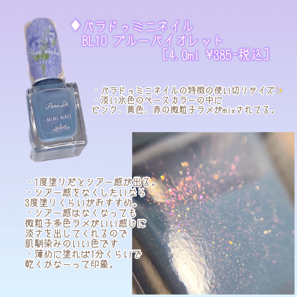 こんにちは🌸こんばんは🌃おはようございます☀️コスメをひっそり愛するたぬ姫です!今回ご紹介したいのは#パラドゥミニネイルBL10ブルーバイオレットです!4月21日発売のパラドゥ新作ネイルは「ロマンティックブロッサム」がテーマだそうです!全6色...
