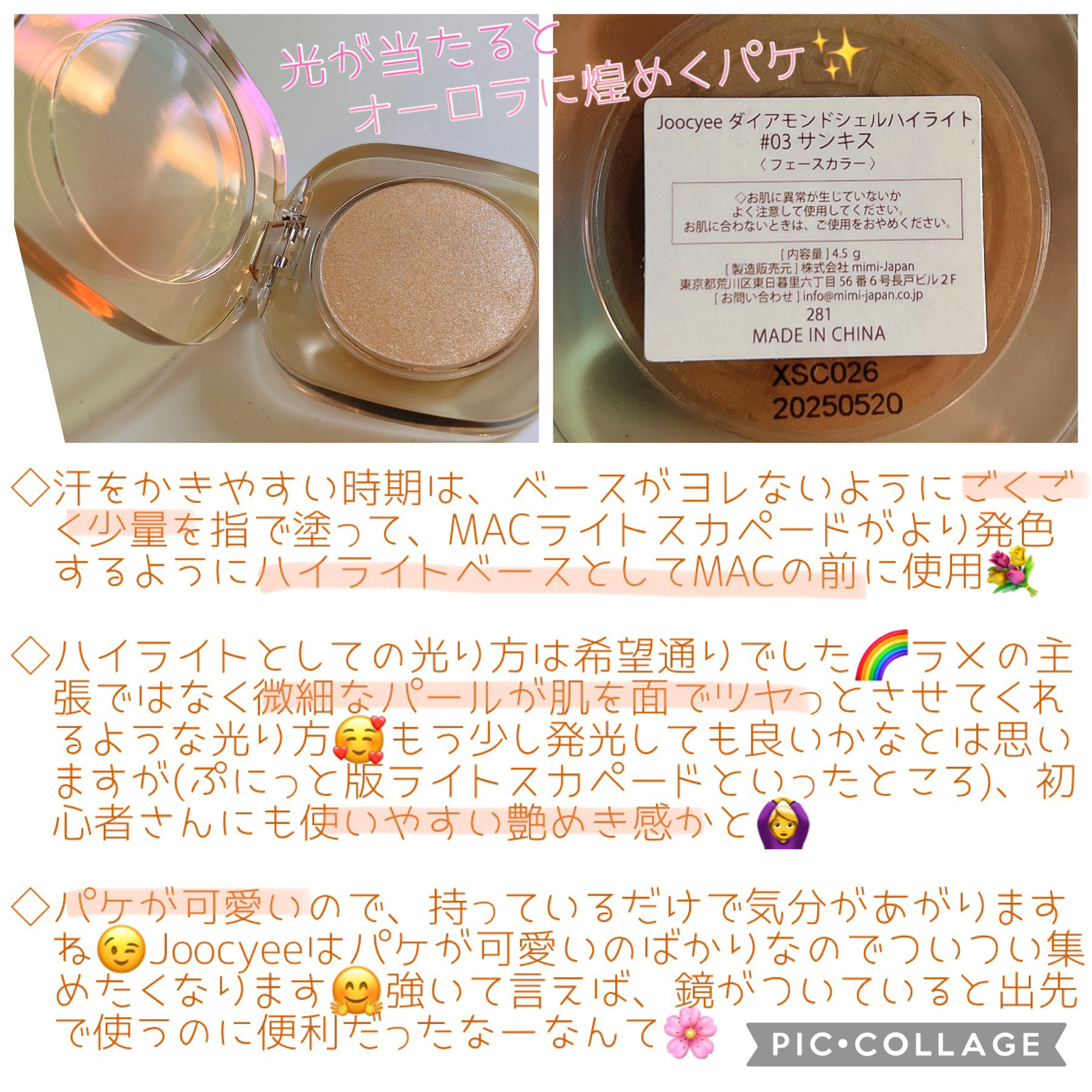 joocyeeダイヤモンドシェルハイライト03サンキスAmazonにて完全パケ買いでした2021年から使ってる…🫣たまにしか使わないから全然無くならないです(笑)しっとりした使用感。あまりハイライトは買ったことないのでわかりませんが、クリーム...