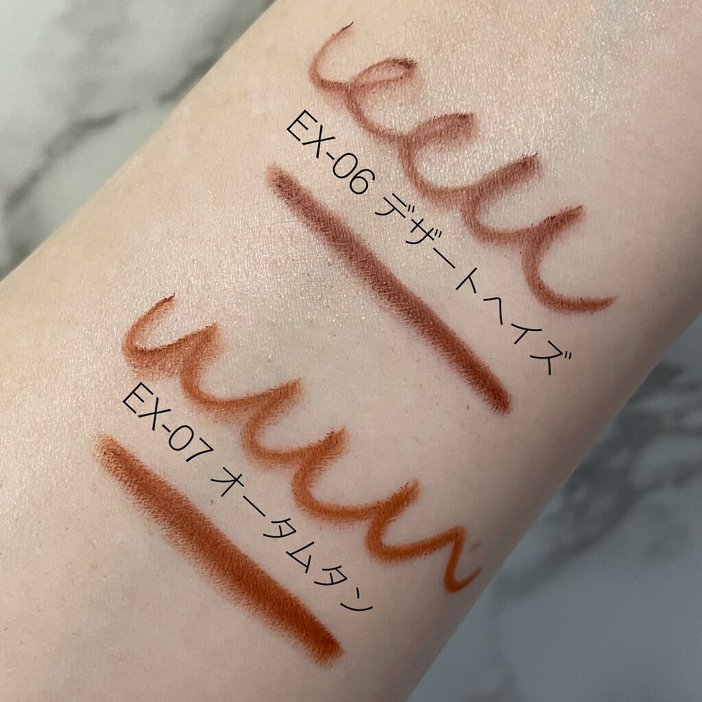 RMKソフトファインアイペンシル✨EX-06デザートヘイズEX-07オータムタン2021.08.06発売(限定)∴ ∵ ∴ ∵ ∴ ∵ ∴ ∵ ∴ ∵ ∴ RMKの秋コスメ🍁暖色系カラーがメインとなっているコレクションで、シックなカラバリ。アイシャドウが気になって予約して、引き取りに行った時に、このソフトファインアイペンシルをBAさんにオススメされて、みせてもらって、感動して購入しました☺️色みが良いのはもちろんなんですが、柔らかいのに程よい硬さもあるペンシル自体の質感に感動したのです❣️❣️❣️まつ毛とまつ毛の間を埋めるのには、硬すぎてはいけません🙌ラインをひくには、やわらか過ぎるものではヨレの原因になります🙌🙌そして、私は一重。アイシャドウの締め色は、しっかり目が好み。左右の目の幅や高さの違いを微調整するのに、締め色や、アイラインで整えます。ぼかしたいところと、シャープにスッとひきたい部分があります。今までは、まつ毛の隙間埋めようと、ラインをひくものとを分けていました。この手間を1本で解決してくれるんです、ソフトファインアイペンシルは❤️鮮明なラインも、スマッジしても、自由自在に使えるアイペンシル。濃密でマットな発色が肌から浮くことなく、なめらかにフィット。ジェルオイル処方を進化させ、やわらかさとほどよい硬さを両立し、描きやすさを実現。まつ毛とまつ毛の間をうめる時もするするとした描き心地です。塗布した瞬間、ジェルオイルがやわらかくなめらかにとろけて密着するため、付属のチップでぼかしたり、目尻をはねあげたキャッツアイにしたりと、デザインは思いのまま。 (公式より)一重の私にとっては、綺麗にぼかせることはとっても嬉しいのです👍ほっそいアイラインなんて、どこ行ったか分からなくなるので🤣ぼかして、太めにしたいのです❗️なめらかな描き心地なので、ベッタリすることは無く、肌にピッタリフィットします。そして、そして、落ちにくい🎊ほんとヨレないし、消えっちゃったりしないです。オフにはポイントメイクリムーバーの使用をオススメします❗️【EX-06デザートヘイズ】レッドブラウン。深みのあるブラウンで、目元がグッと引き締まります。深みがあるけれど、重たい印象は感じず、『魅力的』という言葉があるような感じがします。【EX-07オータムタン】オレンジブラウン。明るいブラウンで、軽やかな印象。深みを出したくない時や、軽い印象にしたい時に使いやすいカラー。こちらのカラーは、ぼかして広範囲に使ってもかわいい発色。オレンジメイクの時に、ベースカラーとオータムタンだけで仕上げてもかわいい全くノーマークだったのだけど、これ、とっても気に入りました🥺既存色が4色あるみたいなのですが、こちらも同じ使用感なのかな❓RMK、ちょっと気になってきた💕#RMK#rmk#ソフトファインアイペンシル#ex06#ex07#デザートヘイズ#オータムタン#秋コスメ#アイペンシル#アイシャドウ#アイライナー#限定コスメ#デパコス