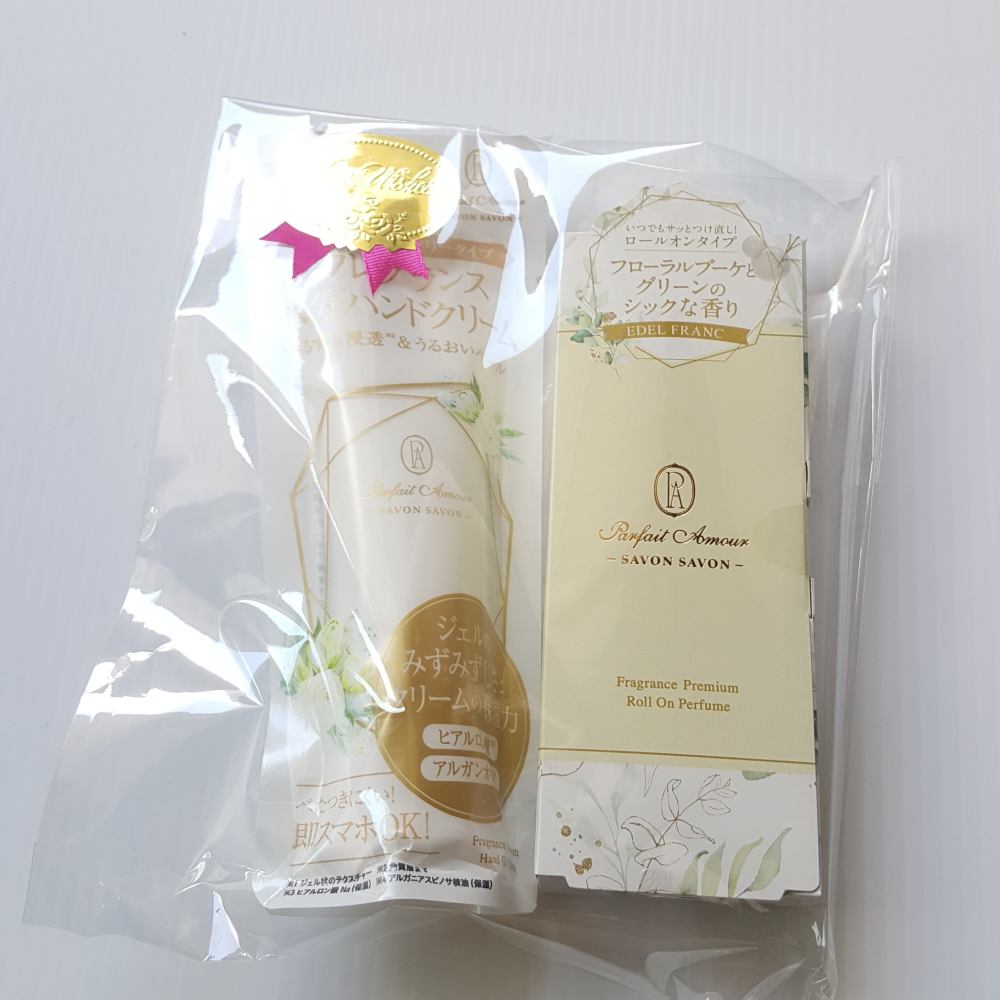 パルフェタムールサボンサボンフレグランスプレミアムロールオンパフューム エーデルフラン細身で直接塗れるロールオンタイプのパフューム。フローラルブーケとグリーンのシックな香りです。ふわっと香っていい香りです。フレグランス水分ハンドクリーム エーデルフランジェルのようなサラッとしたハンドクリーム。肌に直ぐに馴染んで、べたつきがないのでスマホもすぐ操作できちゃいます。ジェルのサッパリ感とクリームの保湿力のバランスが凄くいいです。。小さめタイプで持ち運びしやすいので、保湿したい時や、リフレッシュしたい時におススメです!#PR#パルフェタムールサボンサボン#ロールオンパフューム#ハンドクリーム#ボディーケア#香水