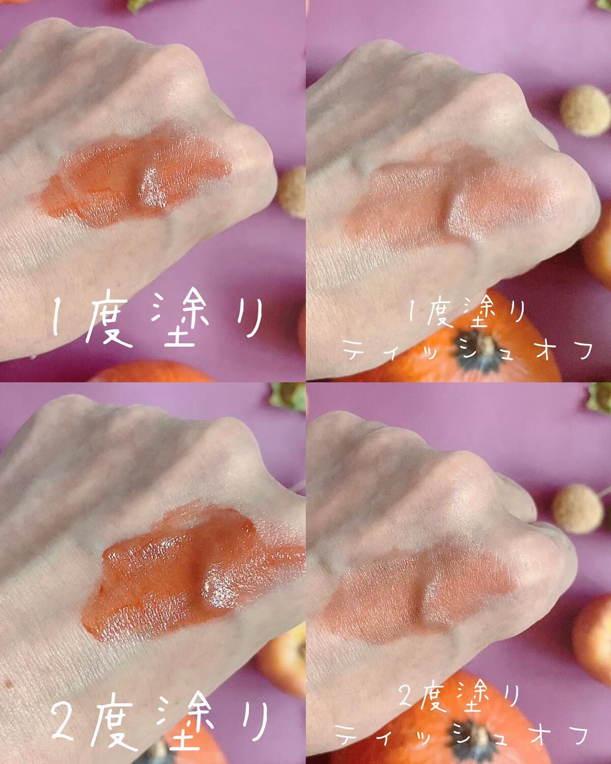 濁りのない赤だけどバキッとしすぎずちょうどよく顔色が良くなる これは元々の唇に真っ赤のフィルターかけたみたいに色が変わる でも濁りのない色だからどよーんとしたりボケた印象になったりしない メンソレータムのリップクリームくらい若干スースーする 色持ちはティントだからまあそれなり、食ったら落ちるけど食わなきゃなんとか持ってる 発色がきつくないから落ちてもあんまりわかんないし汚くならない アイメイクゴリゴリにやったからリップ抑えめにしたいけどぼやけたくないってときにめっちゃちょうどいい…神でした