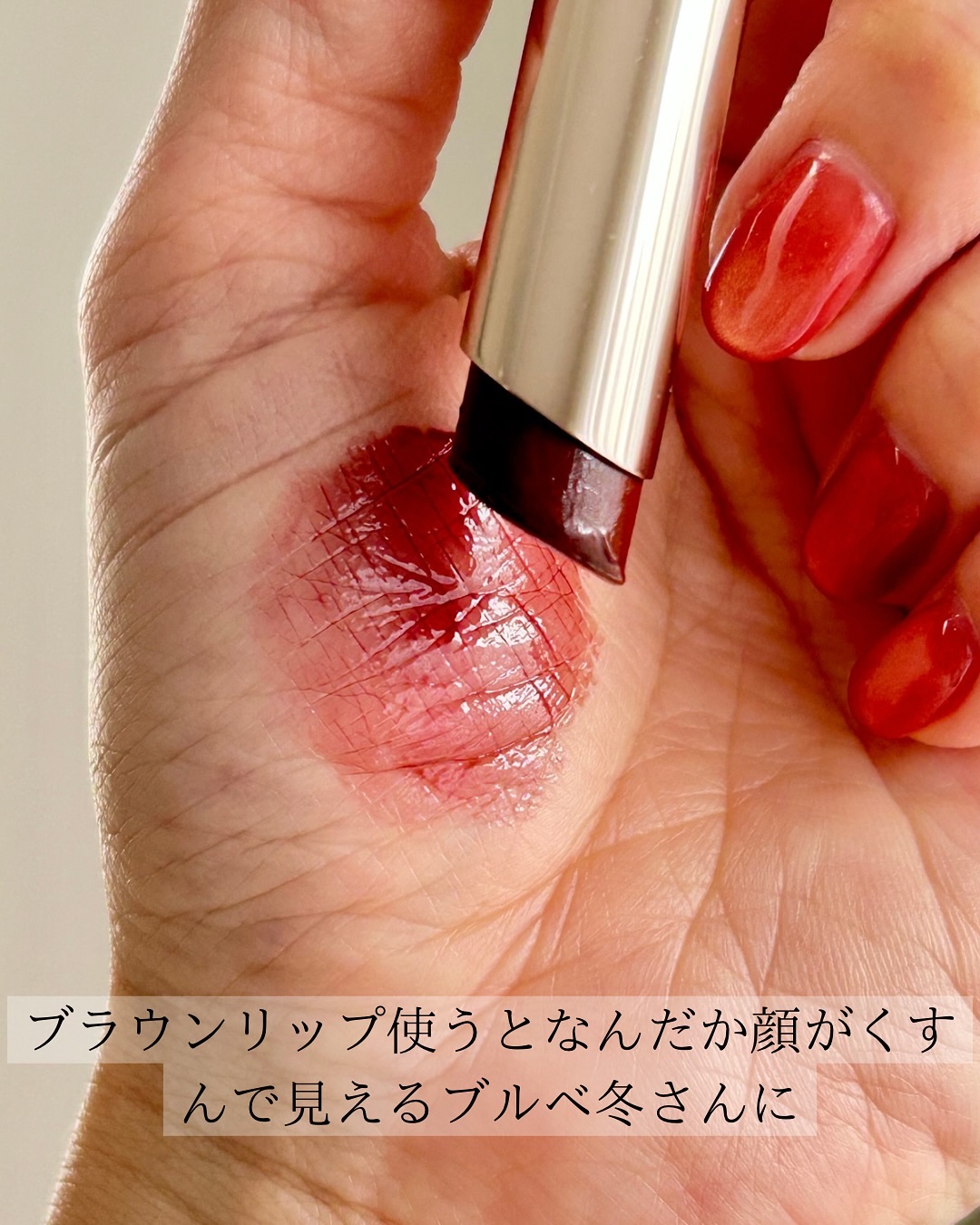 ブラウンリップはイエベさんにしか楽しめないカラーかと思ってましたが、 ブルベさんにも似合う素敵赤みブラウンです🥰🥰🥰 とってもおしゃれなカラーなので私もこの季節大活躍させよっと。お世話になります!!!笑