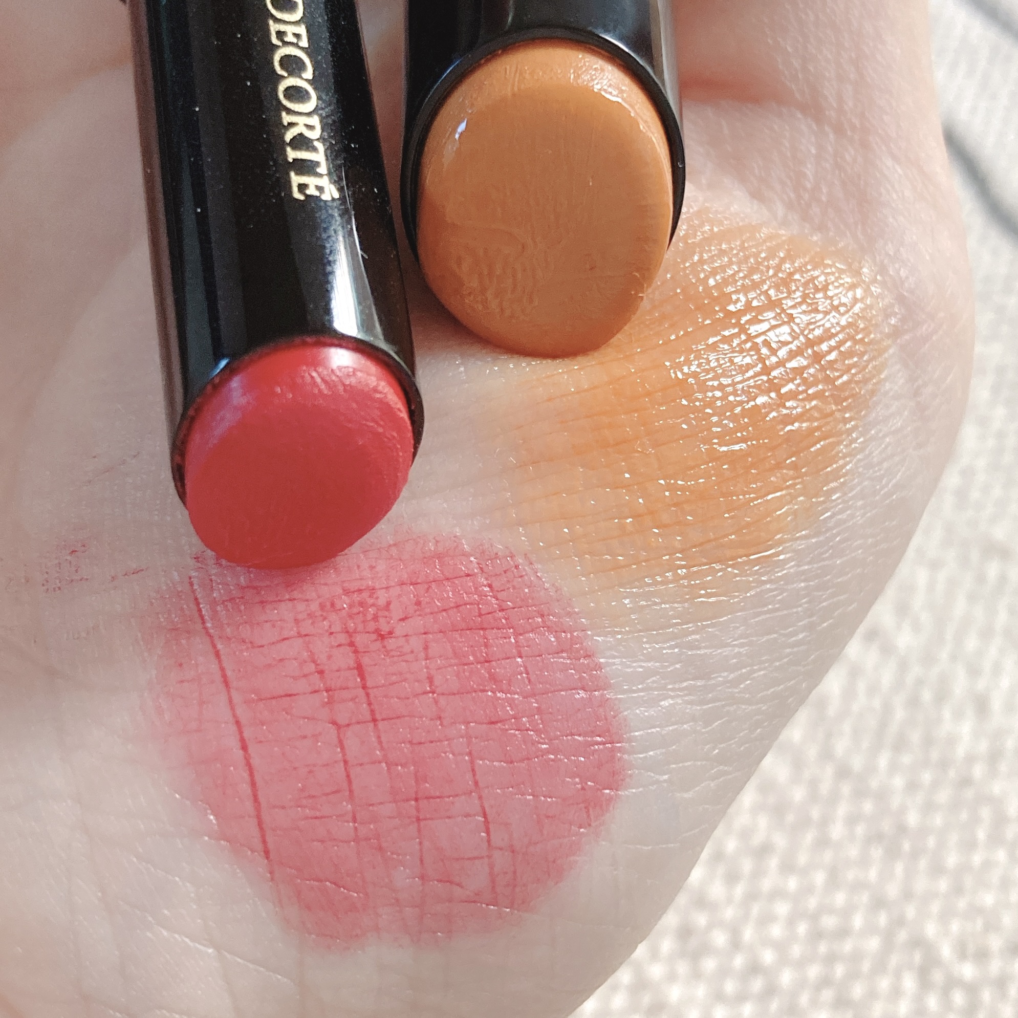KATEリップカラーコントロールベース✖️DECORTÉルージュデコルテ04使いにくい赤い色も黄色のリップがあれば使いやすくなりますベージュぽくなりますデコルテの方はサンプルのミニリップです強すぎない香り付きでいい香り