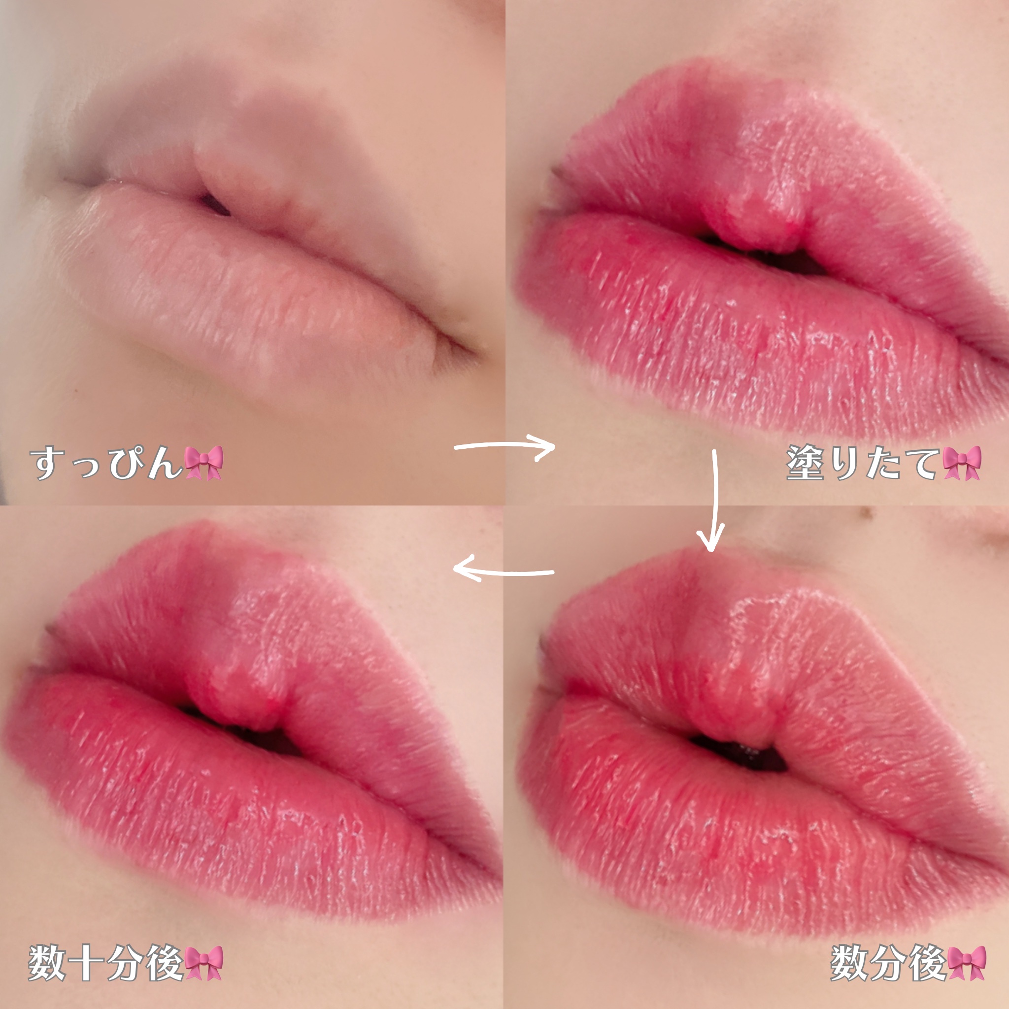 傾けるとこぼれるくらいサラサラなので、蓋が空いてるまま横に置かないように注意⚠ 塗ると徐々に唇がヒリヒリスースーしてきます*.+゚ 仕上がりは唇がふっくらむっちりぷるんぷるんに*°♡ ちゅるんとしたツヤ感もでてとても可愛いです❁⃘*.゚ こちらのカラーは青みピンクカラーで、全体に塗っても可愛いけど内側を中心に塗ってグラデーションにするともっとぷるん感がでてすごく可愛い仕上がりになります⸜❤︎⸝