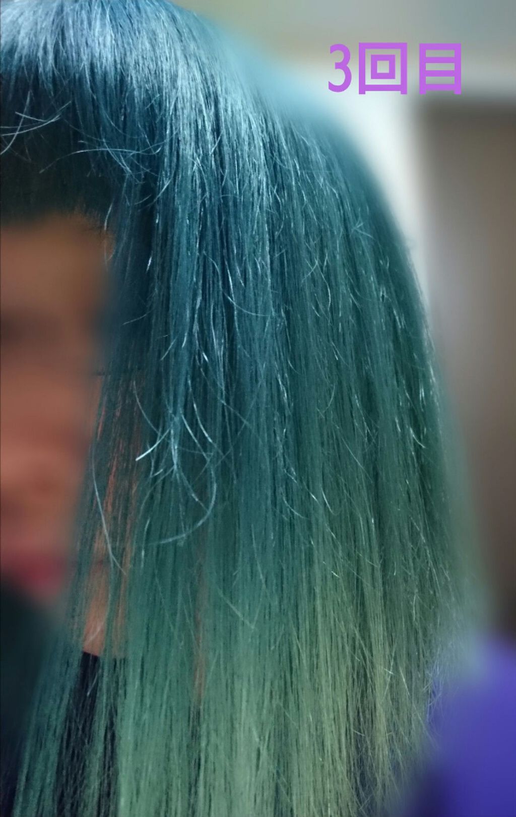 派手髪に憧れてブリーチをしたのでヘアカラー剤を購入してみました!今回はシュヴァーアンサンブルヘアカラーペーストトリートメントのブルーを使いました。本当はマニパニとか評価高くて使いたかったんですけど、金欠だったので安めのこちらにしました笑【商品の状態】・テクスチャーは硬め(髪に馴染ませにくかったです)・無香料の薬用リップみたいな匂い(甘い匂いとかしません)・爪につくとマジで落ちないです(ゴム手袋必須)【髪の状態】(染める前)・黒髪→ブリーチ2回目→ミルクティーアッシュっぽいカラー・その1ヶ月後→ブリーチ2回目→紫シャンプー・全てセルフです(1回目)・通常のリンスと同じように髪に馴染ませましたが、テクスチャー硬めなので馴染ませにくく、偏りが半端なかったです。・反射で薄く見えますが、まあまあ染まったかなという印象でした。・紫シャンプーを使ってはいましたが馴染ませにくく片寄りも酷かったので、エメラルドグリーンっぽくなりました。(2回目)・髪の毛をいくつか結んで分けて少しずつ馴染ませるようにしたので、1回目よりも色は入りました。・また1回目より使用量と置き時間を増やしました。(3回目)・2回目でトリートメントが行き渡ってないところをメインに使用後、全体的に馴染ませました。・結構色は入ったんじゃないかと思います。【感想】今回初めてヘアカラートリートメントを使用してみましたが、こんなに硬くて伸ばしづらいのか…と思いました。(他のもそうだったらすみません)そのためかなり偏りやすいです。(ブリーチもセルフだったのでそれも原因かもしれないです。)でも、個人的にはグラデーションっぽく仕上がったので気に入ってはいます!パッケージのような真っ青なカラーを期待するならしっかりブリーチするか、他のヘアカラートリートメントを使用した方がいいかもしれません。ちなみに通常のシャンプーでじわじわ色落ちしていくので、だんだん青→緑っぽくなっていきます。残量については髪短めなのでまだ余裕でした。