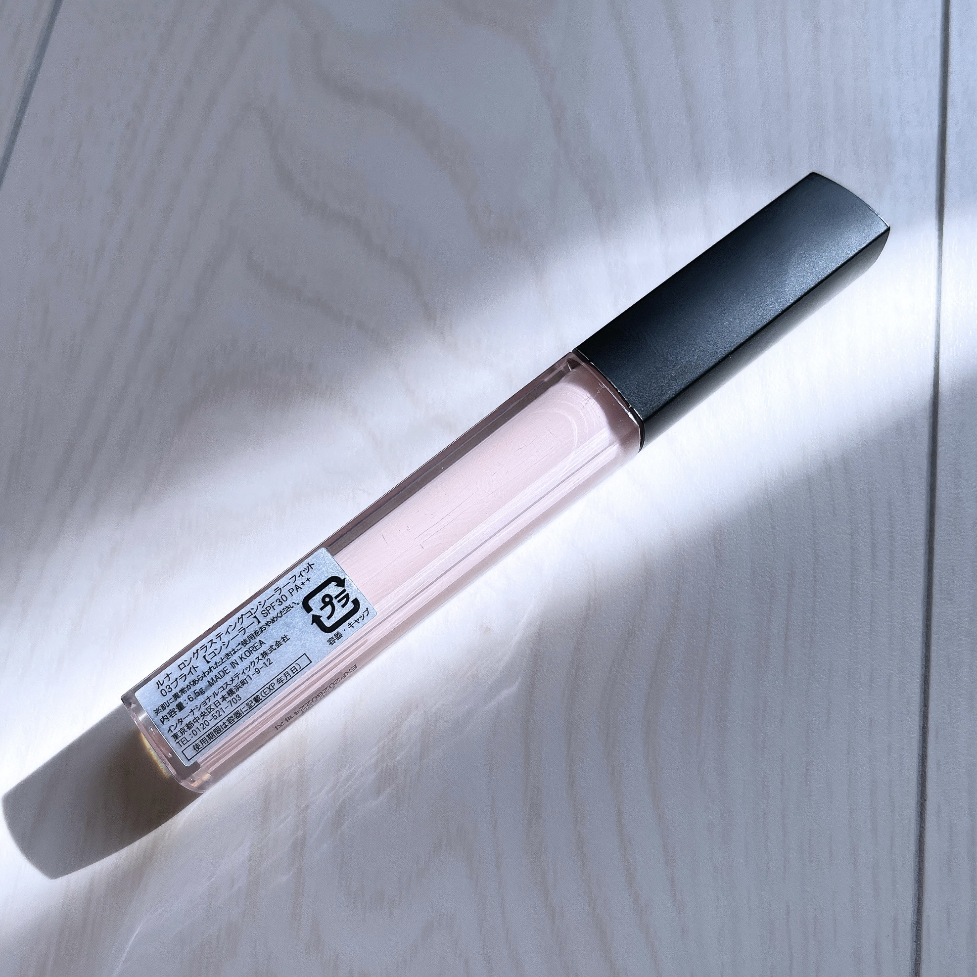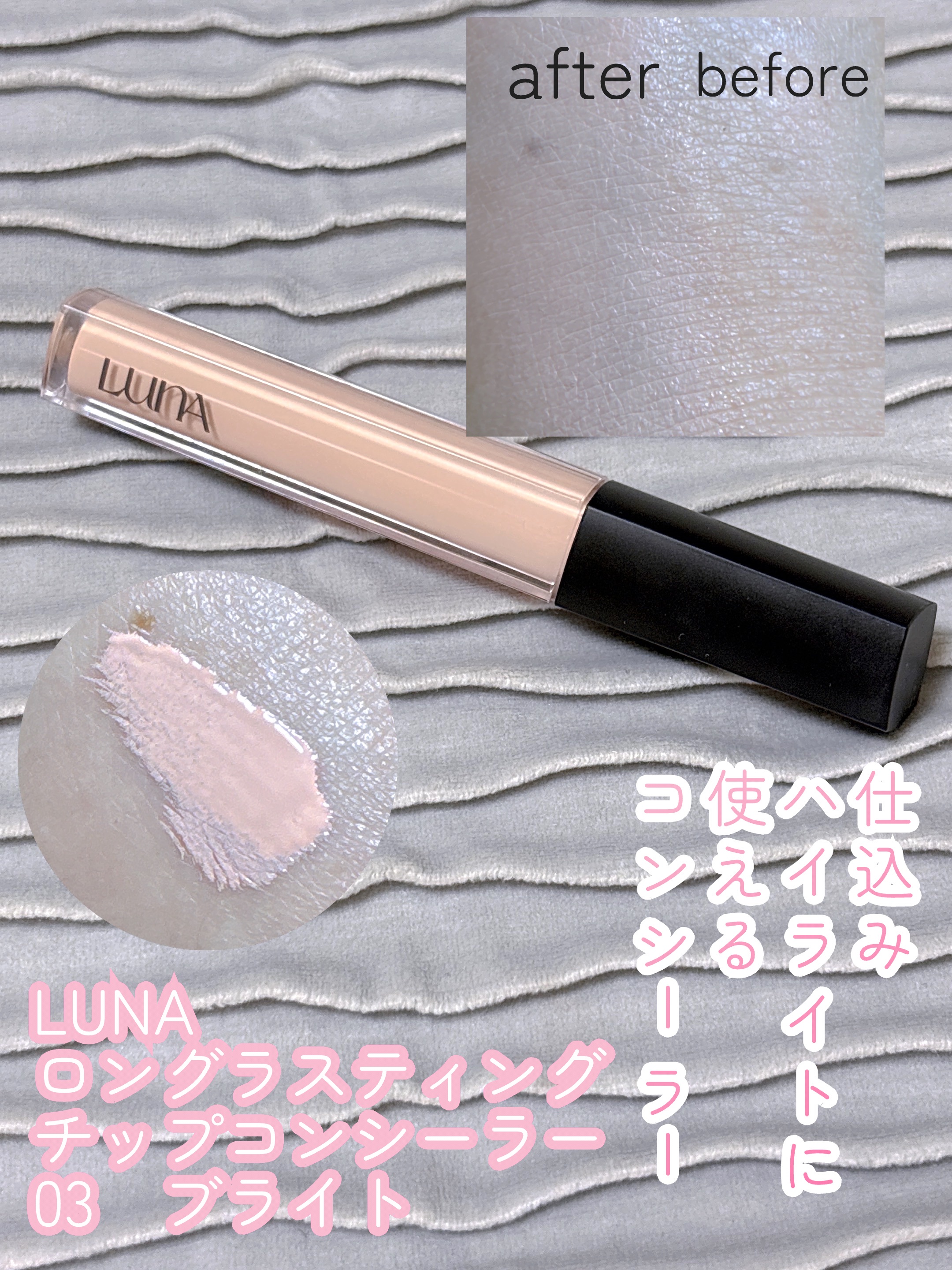 LUNAロングラスティングチップコンシーラー03ブライト ピンク色のコンシーラー。ハイライトカラーとして使用しています。サラッとした質感で広げやすく厚塗り感も出ません。#コンシーラー