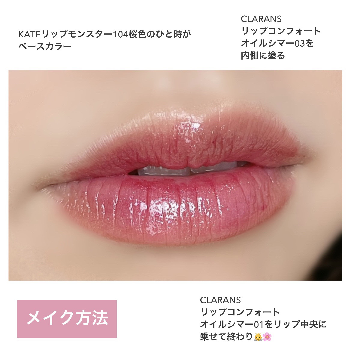 今日のリップ🥰組み合わせたリップを投稿するの久しぶり🌸♡使用したリップKATEリップモンスター104桜色のひと時(今日GETしてきたよ✌︎✌︎)ベースカラーCLARINSコンフォートリップオイルシマー01(リップ中央に乗せる).03(唇内側に塗る)桜色のひと時はほんのり朱色っぽい👀🌟⋆꙳3色の中でも人気カラーで完売してたよ🥹何店舗か回ってGET🙋♀️つやんつやんで可愛い組み合わせです🌸👼#今日のリップ#リップモンスター#104桜色のひと時#限定色#CLARINS#コンフォートリップオイルシマー#コスメ購入品#リップ#組み合わせリップ