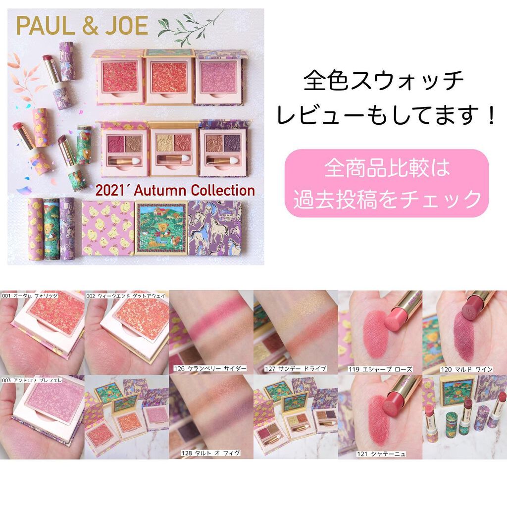 \ポルジョの秋コレ/全商品レビュー!パケもカラーも可愛い商品勢揃い✨◆───--- - -- - -–--───◆ポルジョの秋コレは2021年8月1日に発売!そう!本日です!!!今回は全商品のまとめスウォッチのみで、このあとそれぞれのコスメを組み合わせてメイクした詳細レビューも3回に分けて投稿していきます✨=========================PAUL&JOE〝週末のお出かけ″がテーマの秋コレ2021秋コレクションでは✔︎アイシャドウ3色✔︎チーク3色✔︎リップ3色✔︎ケース6種類全て限定での発売=========================なんとも可愛いパケで、持ってるだけでテンション上がるコスメで使うと更にカラーの可愛さにも痺れます🥺✨カラーもパケも全て限定となっており、入手できるのは今だけです。ポルジョは商品とケースが別売りになってるのがスタンダードなので、好きなコスメと好きなケースを自分で選んで組み合わせる事ができます!見た目が可愛いだけでなく、デパコスの中ではお手頃なお値段です☺️秋コスメという事で、オータム色ばかりかと言うとそうでもなく、しっかりブルベカラーもあってブルベさんでも楽しめる秋コスメになってます🙆♀️✨本日からオンラインと店頭で限定発売なので、気になった方はぜひお早めにチェックしてみて下さい🙏以上になります❣️#夏のマストバイ