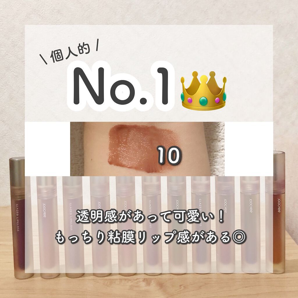 Joocyee フルーツミラーリップグロス は、とっっってつもなくぷるるるんすぎるジューシーなリップグロスなんです❤️🔥 カラー展開も豊富なので自分の好きなカラーを選べるのはもちろん、付け方次第でナチュラルにも仕上がるのでめちゃめちゃおすすめです!!! 沢山の種類豊富の中でも私の1番のオススメカラーは、12番の柿ゼリーです! リップグロスなのでマスク移りはしてしまうのですが、塗りたてから1度ティッシュオフした後また塗り直しして今度は指で馴染ませるとマスク移りはしてしまってもそんなに汚くならないし何よりも1度塗りよりも更にジューシーさが増すので試してみてほしいです! 他のカラーも持っていてめちゃめちゃいいのですが、今回購入した"柿ゼリー"は個人的に断トツで高発色なのに可愛すぎて大優勝でした✨