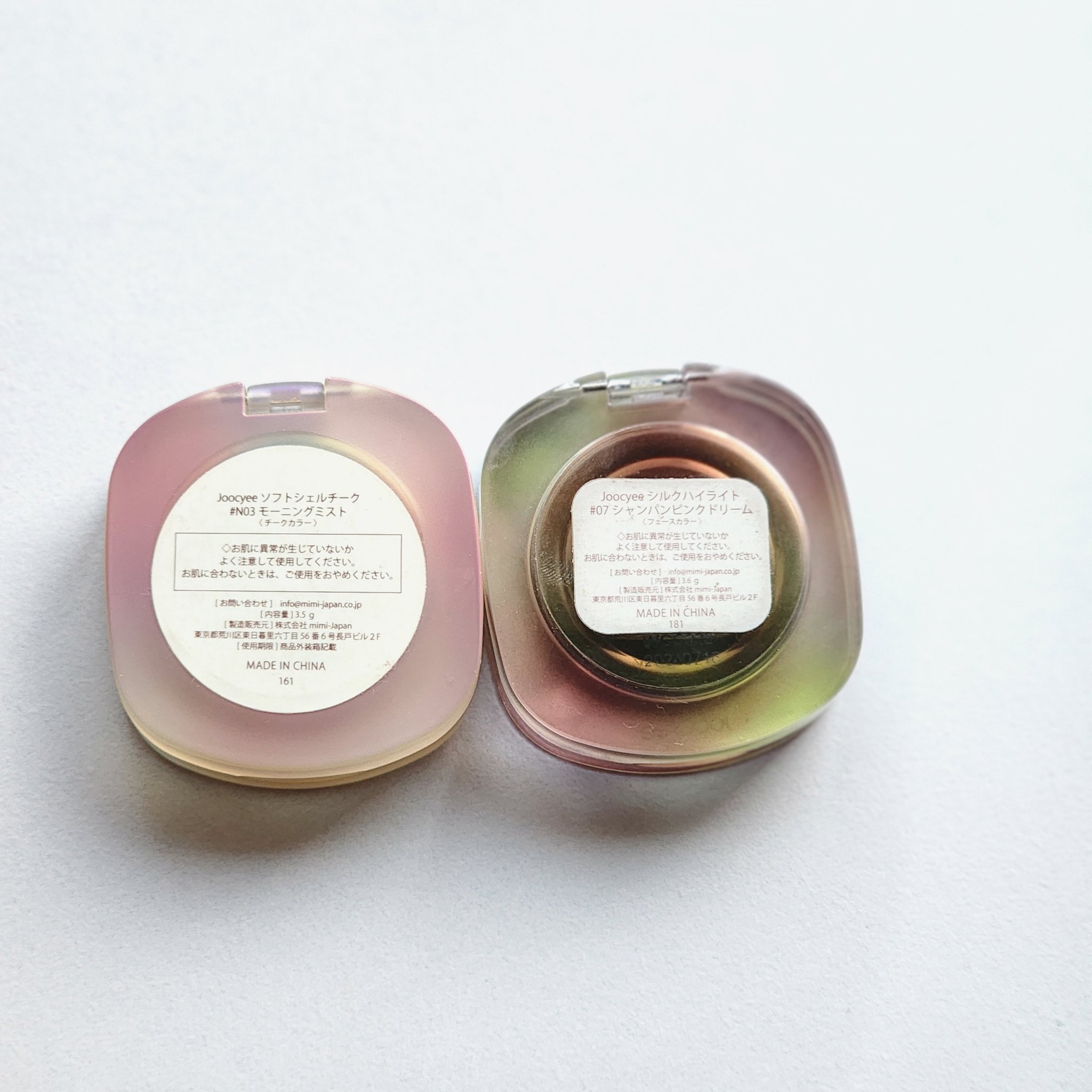 Joocyeeは質がいいのはもちろんですが、何よりもパケが綺麗でテンションが上がります! こちらのチークはマットだけれど、粉っぽ過ぎずしっとりとしています。 ハイライトを使ってポイントでキラキラさせたいので、チークにはラメやパールが入っていないほうが好みの私的に、とても使い勝手がよく感じました。 モーニングミストの色味は、淡くミルキーでありつつ、肌なじみのいいピーチなので使い勝手もとても良かったです。