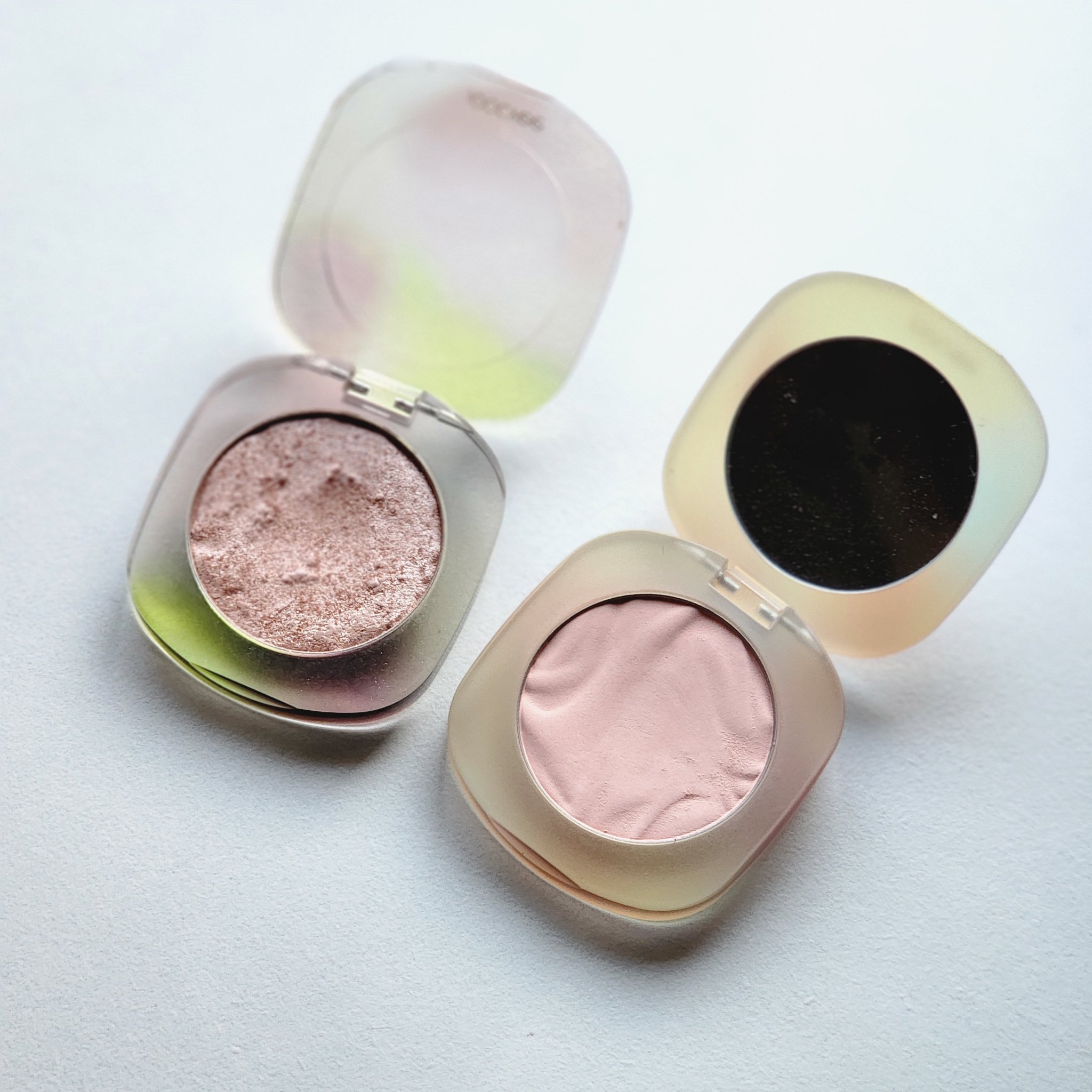 ソフトシェルチークN03モーニングミストのカラーは、すごく優しいピンクで、頬にほんのり血色感出すのにすごくいいよー。さらにチーク重ねても可愛い💕。 ハイライトはパケも中身もキラキラして可愛いけど、つけた感じはそんなに特別キラキラって感じでもなく、まぁ普通のハイライトだった😅。 チークは他の色も気になりますー。