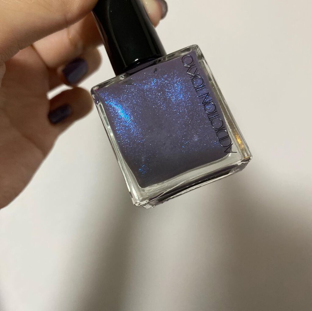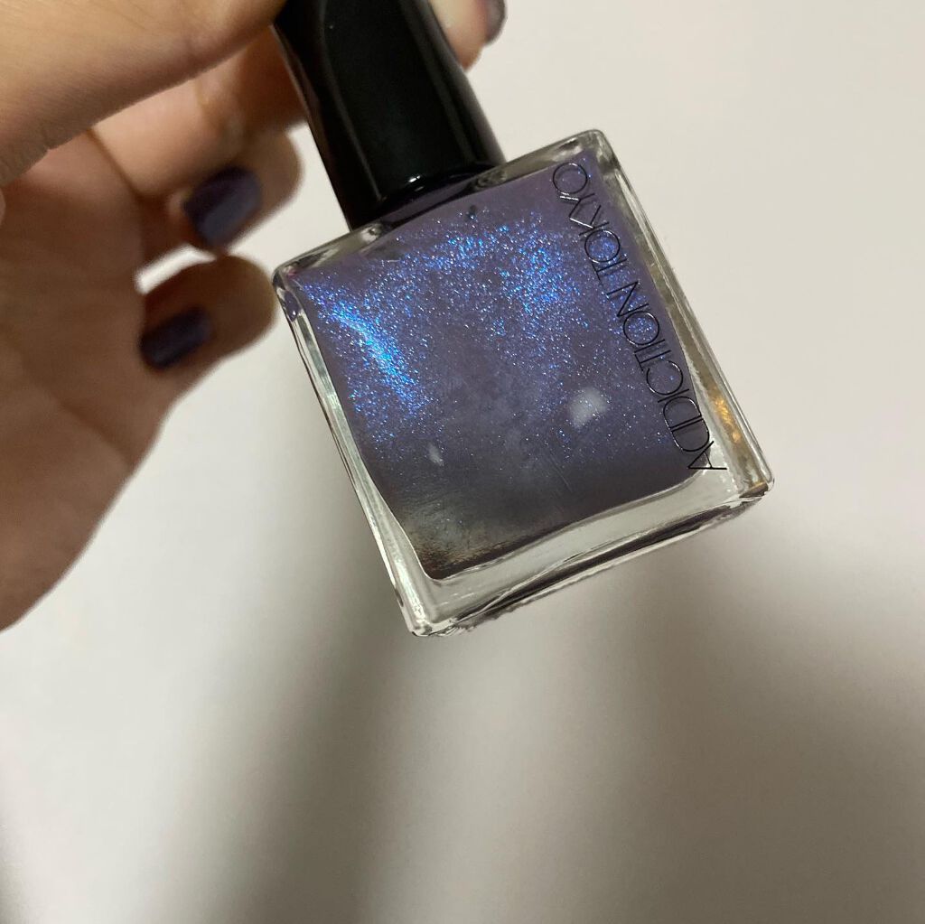 予約ができず諦めてたところ当日発売ラス1でGET😭 人気なのはなんといってもこの青ラメ!! 光に当たった所に青ラメがチラッと輝くのが素敵すぎる。 波が朝日に当たってキラキラしてる感じに似てるからこの名前なんだと思います😌 乾きが早く、ムラなく塗りやすいのはADDICTIONネイルの魅力のひとつ💅
